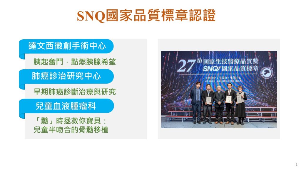 SNQ國家品質標章(Symbol of National Quality)為台灣具代表性的品質認證制度,透過專家嚴謹評審機制,肯定醫療院所、醫療技術及健康照護服務的品質與安全,象徵專業、品質與信賴。