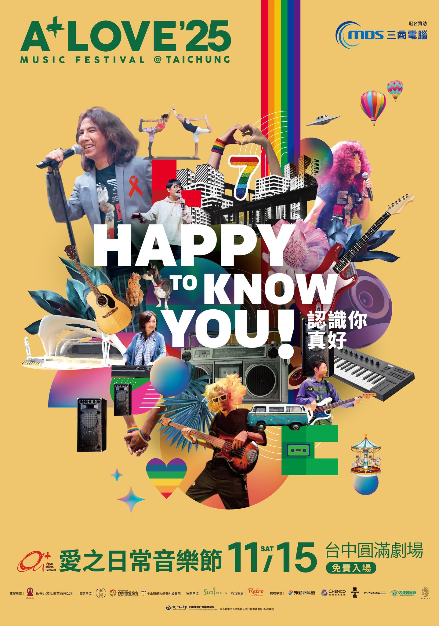 1141115 12月1日為世界愛滋日,愛之日常音樂節《認識你真好!》於2025年11月15日在台中圓滿劇場盛大舉行。這場台灣唯一橫跨洲際、倡議平權並關懷愛滋的國際彩虹音樂節,今年邁入第七屆,以「認識你真好!」為主題,結合音樂,打造一場關於愛、環境與共融的溫暖盛宴。活動全程免費入場,從早晨瑜伽到夜晚音樂演出,預計吸引數萬民眾參與,成為歲末最溫柔也最有力量的戶外聚會 附件