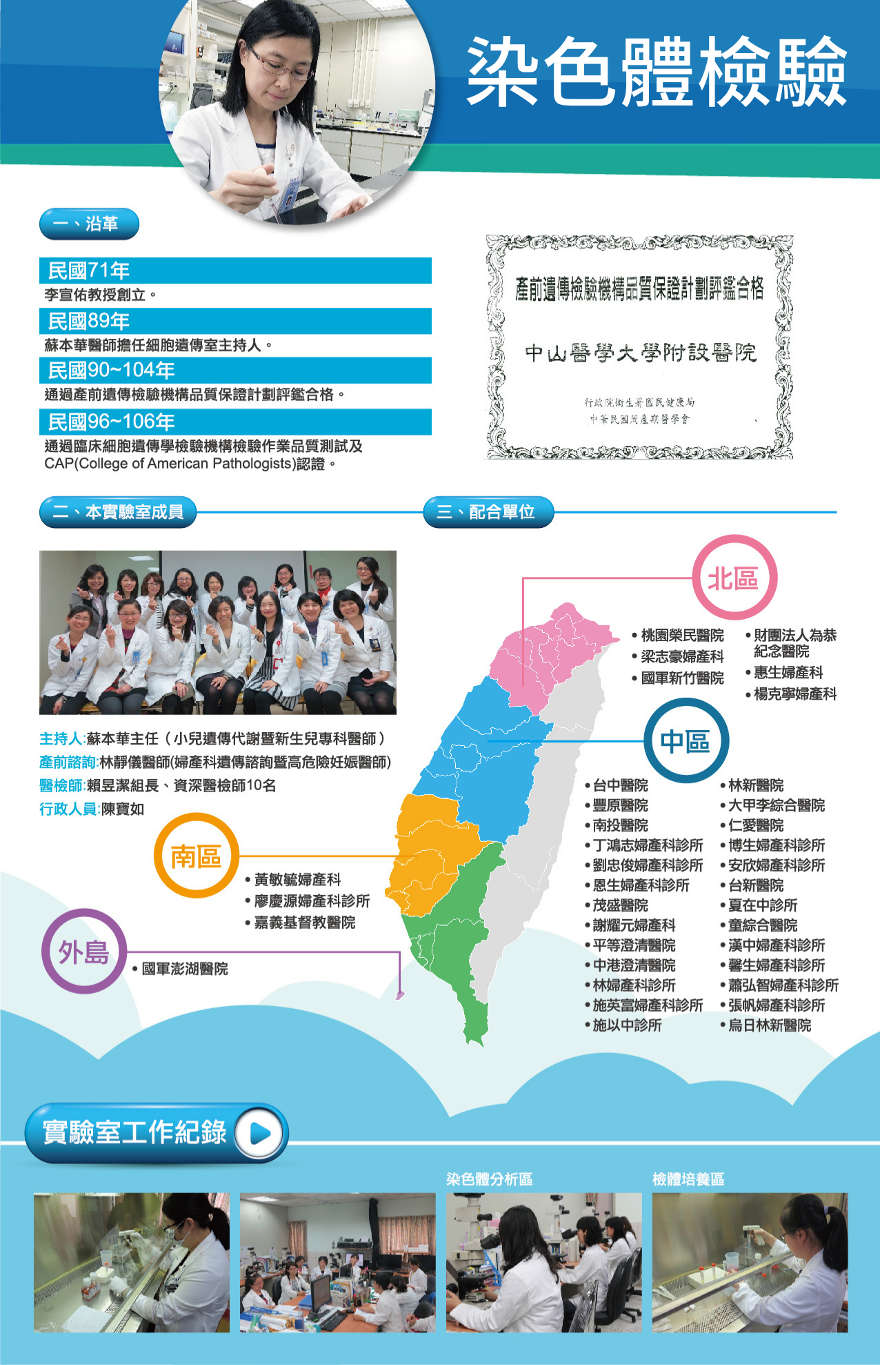 中山醫學大學附設醫院細胞遺傳室成立於民國71年,在產前染色體診斷是台灣最早成立的資深實驗室,為衛生福利部國民健康署評鑑通過之產前遺傳診斷實驗室,且每年參加並通過CAP(College ofAmerican Pathologists)能力試驗。擁有優秀專業人員、先進儀器及便利的收件流程,全年提供高品質服務。主要業務是進行羊水、血液、骨髓、絨毛細胞、流產胎兒組織各類檢體之高解析度染色體檢驗分析。