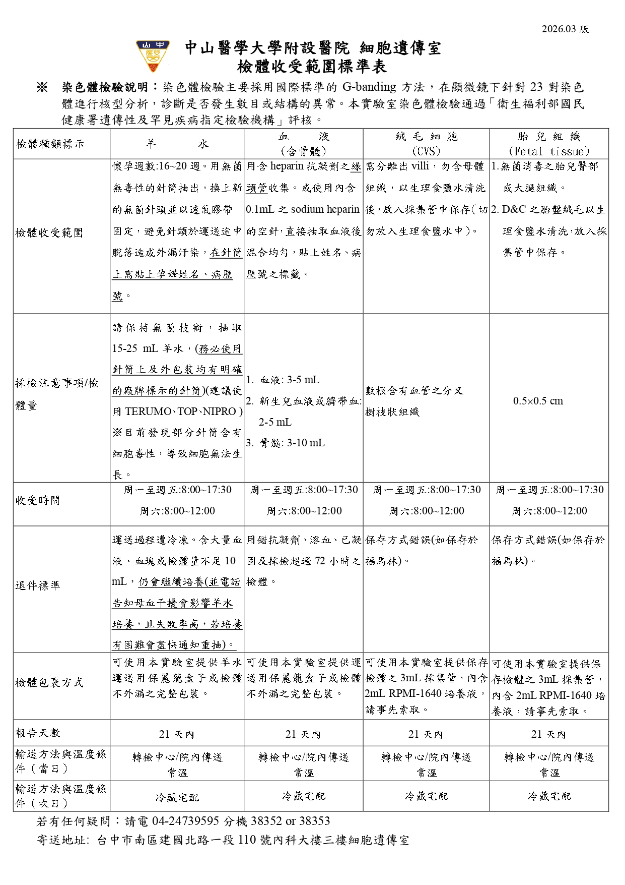 檢驗服務項目包含:羊水染色體檢驗、血液染色體檢驗、骨髓染色體檢驗、流產物胎兒組織及絨毛染色體鑑驗。檢體收受範圍如下表: