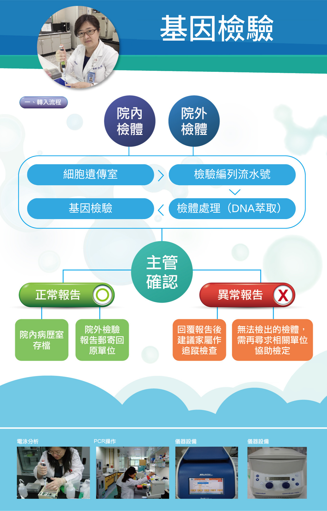 基因檢驗分析實驗室成立至今已逾二十年,隨著單基因疾病研究的增加,我們也跟著增添基因檢驗項目的服務,以利患者及早發現病因。這幾年來我們實驗室自己開發了數十項特殊基因檢驗,也添購了新式儀器與設備。