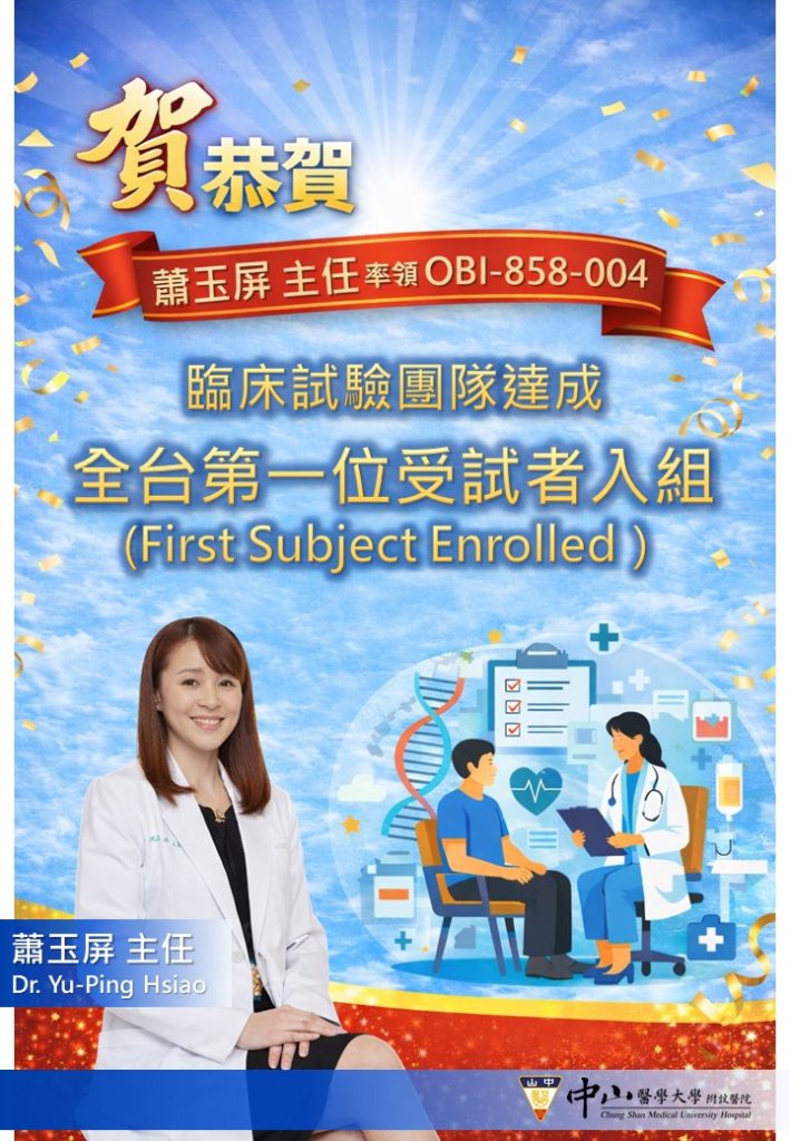 【恭賀】蕭玉屏主任帶領OBI-858-004臨床試驗團隊,達成全台第一位受試者入組(First Subject Enrolled),為本院再創臨床試驗新里程碑! 最新消息 2025-12-222025-12-22 E1472Leave a Comment on 【恭賀】蕭玉屏主任帶領OBI-858-004臨床試驗團隊,達成全台第一位受試者入組(First Subject Enrolled),為本院再創臨床試驗新里程碑!