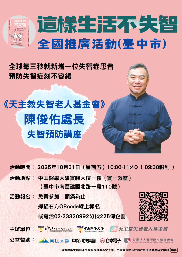 【活動宣傳】這樣生活不失智 Posted on 2025-10-28 by N495 主講者:天主教失智老人基金會 陳俊佑處長時間:114/10/31 10:00-11:40地點:中山醫學大學 實驗大樓實一會議廳報名網址:https://reurl.cc/MM1kzK