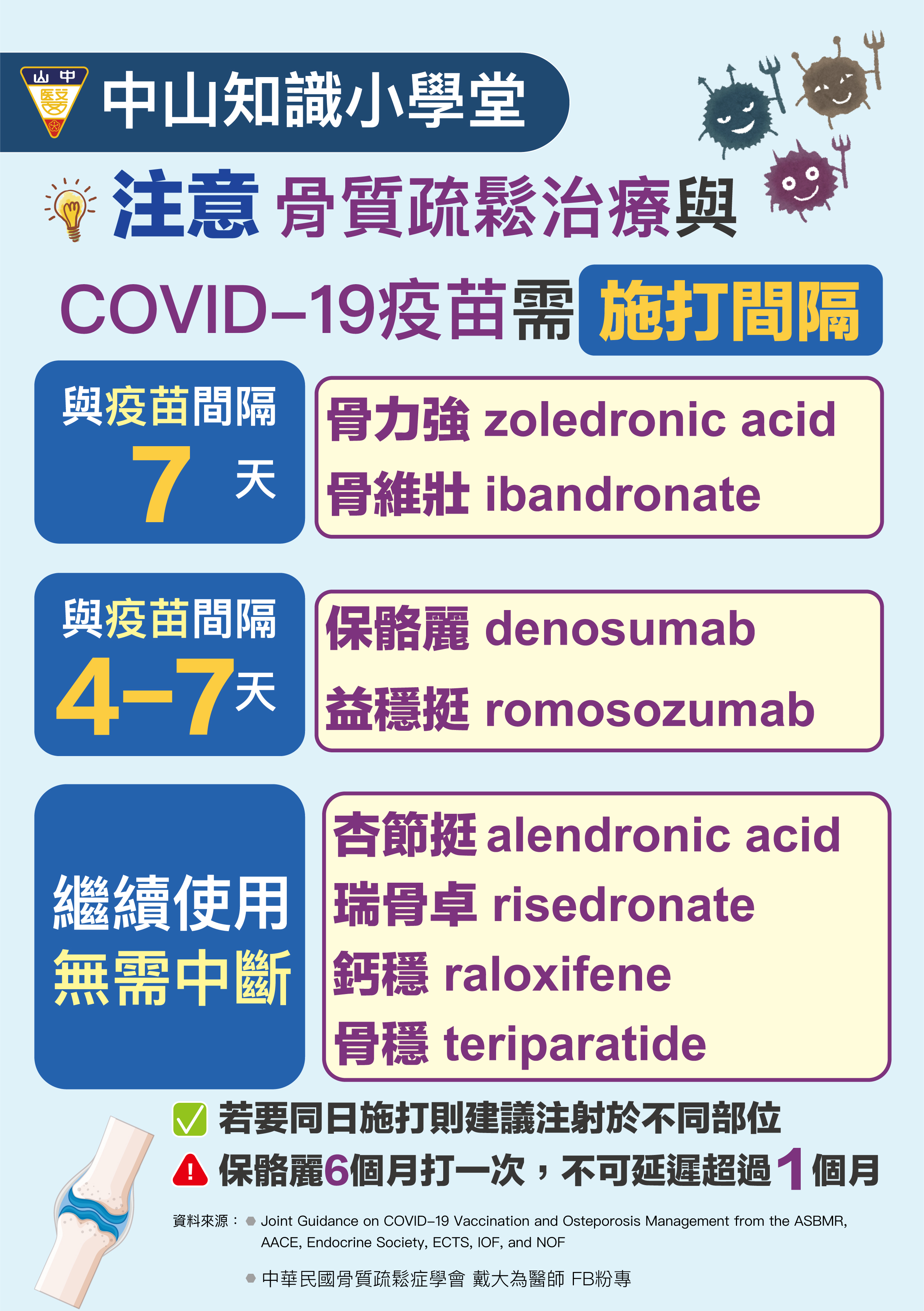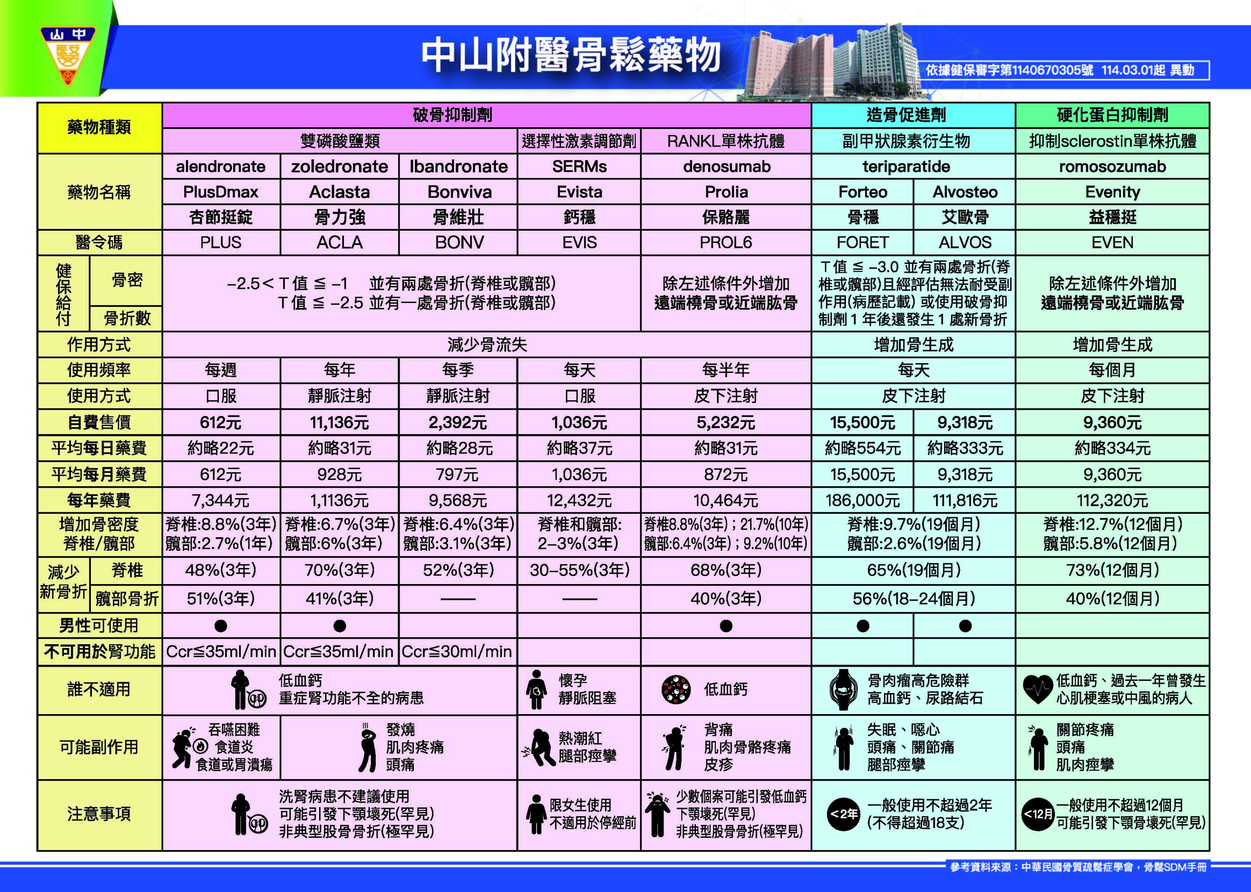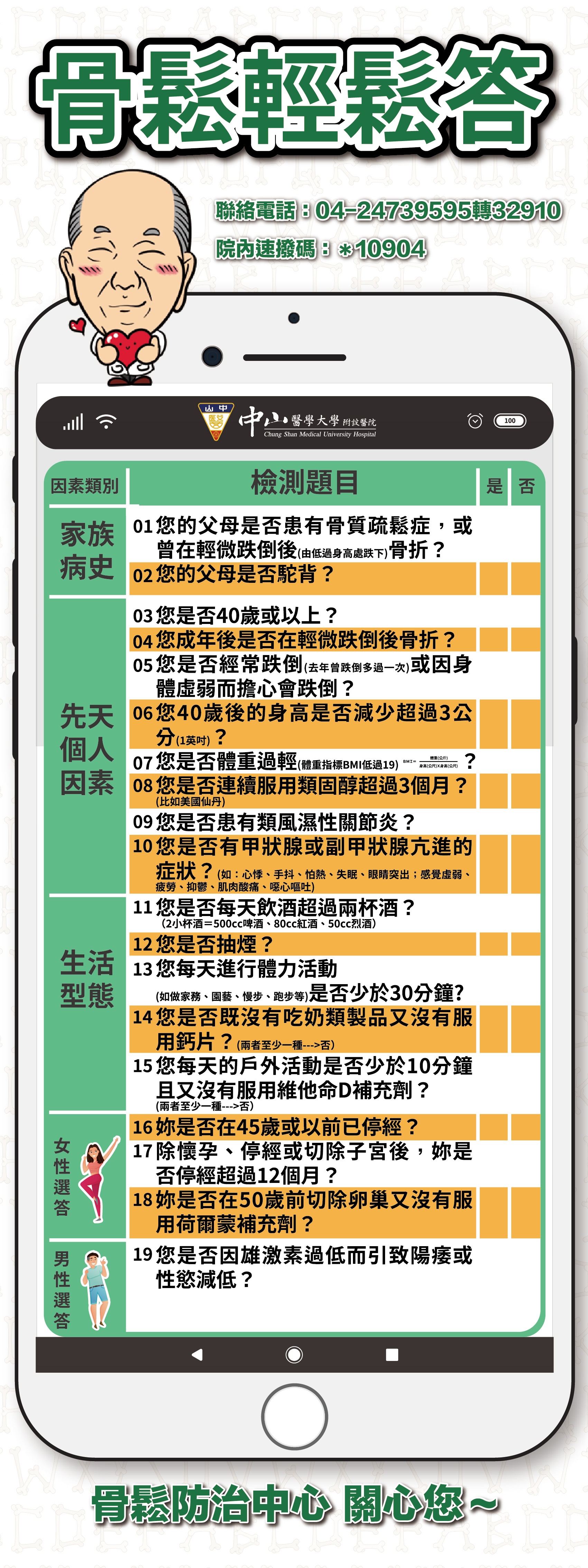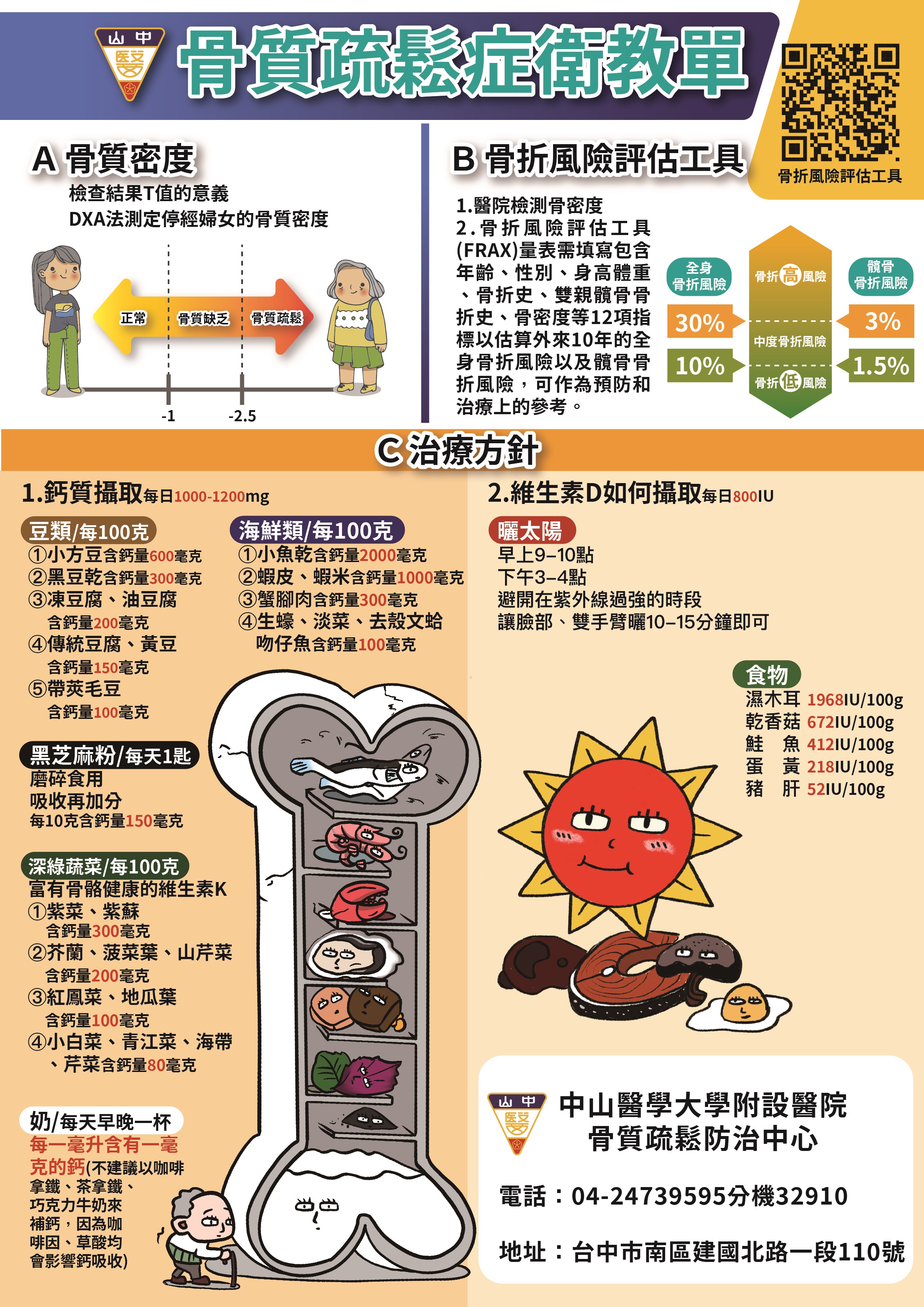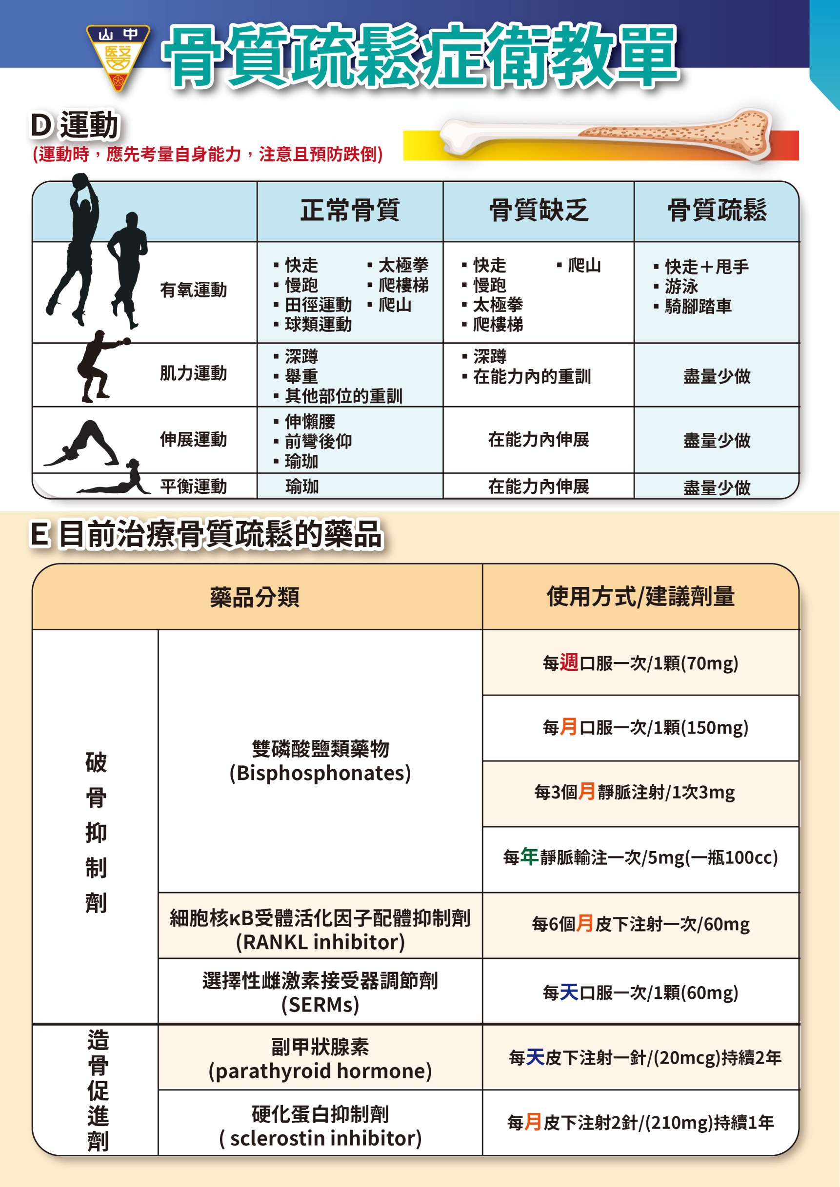 骨鬆衛教單張 骨鬆不煩惱 手術更美好(BHO骨質優化計畫) 2025中山附醫骨鬆藥品及健保用藥新規範 自我檢測骨質疏鬆症 骨質疏鬆症的認識與處理-1 骨質疏鬆症的認識與處理-2 骨質疏鬆症治療與疫苗施打間隔
