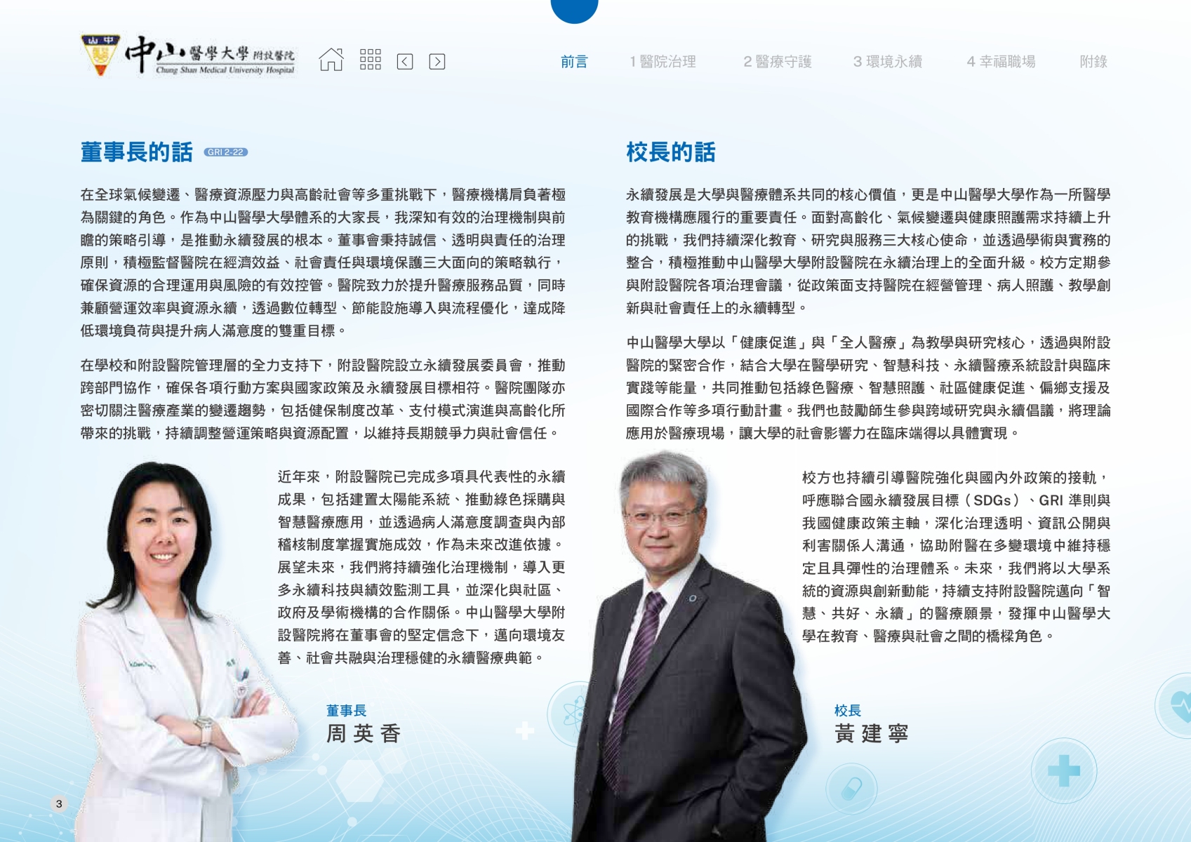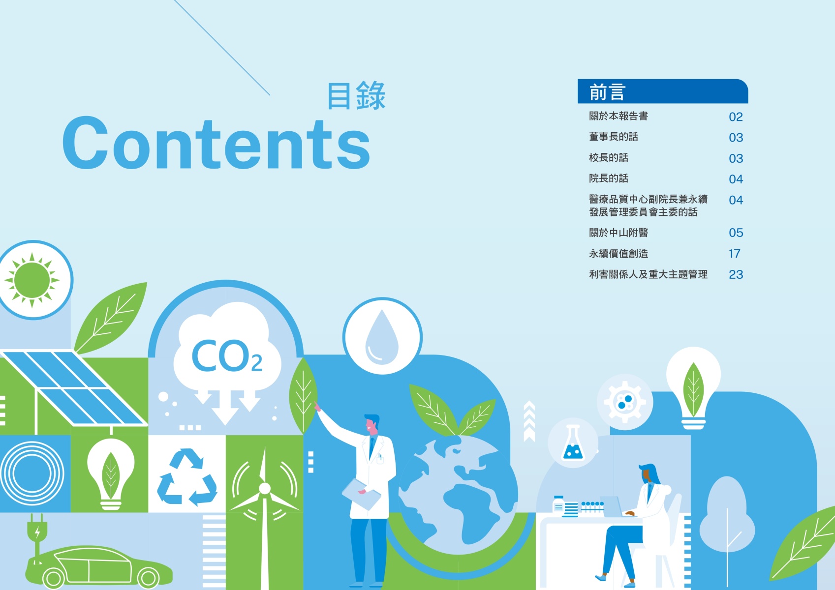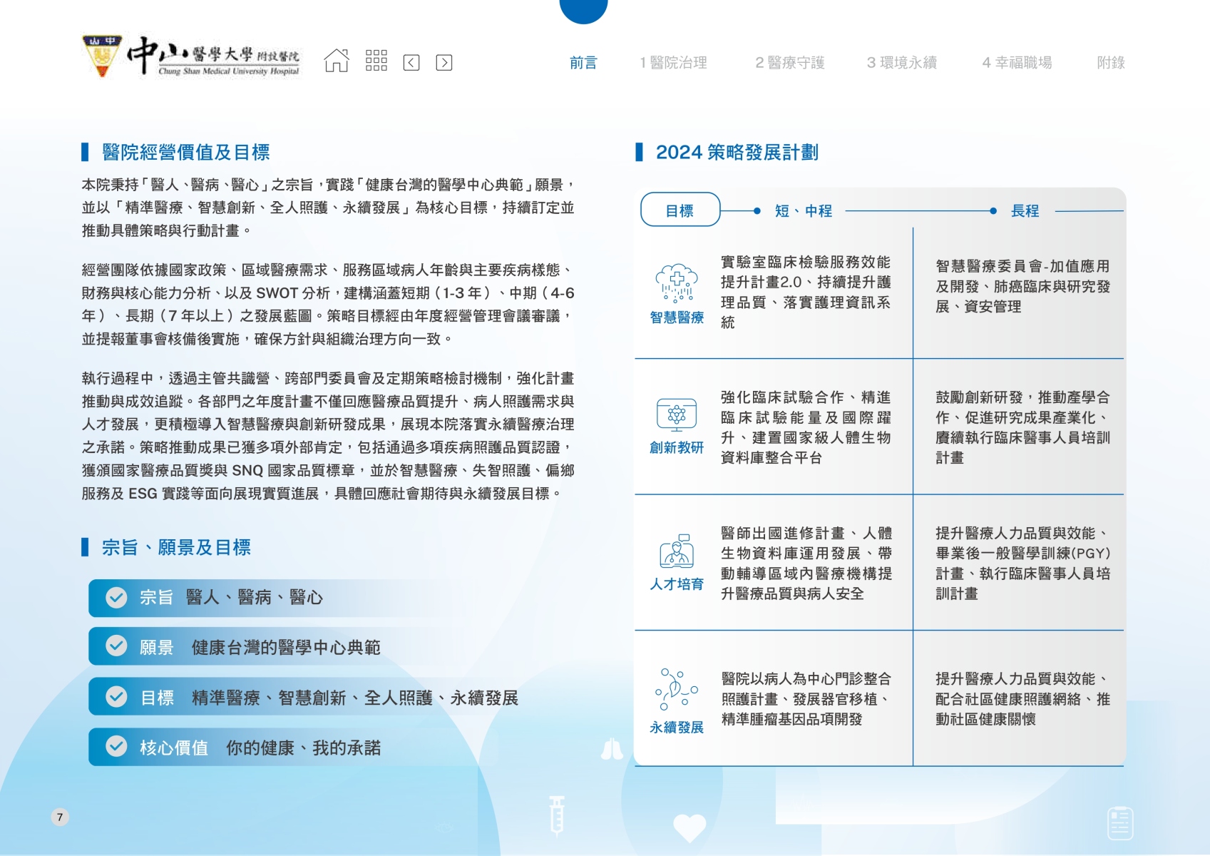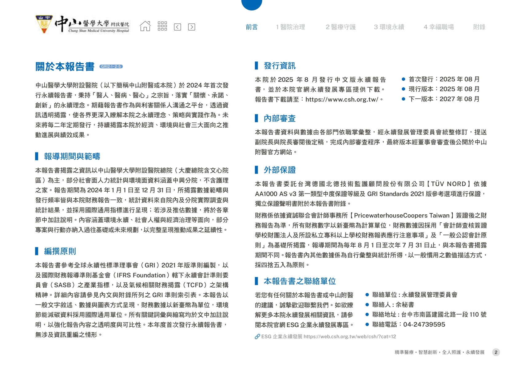中山醫學大學附設醫院於2024年首次發行永續報告書,秉持「醫人、醫病、醫心」之宗旨,落實「關懷、承諾、 創新」的永續理念。期藉報告書作為與利害關係人溝通之平台,透過資訊透明揭露,使各界更深入瞭解本院之永續理念、策略與實踐作為。 未來將每二年定期發行,持續揭露本院於經濟、環境與社會三大面向之推動進展與績效成果。 報告書下載 ✔ 快速瀏覽tip:因報告書檔案較大,如有開啟緩慢情況,可於報告書下載處→按右鍵→另存連結為→存檔,即可順利下載瀏覽。也可點選下方圖片直接查看內容喔~ 1 2 ... 5 ► 2024 永續報告書