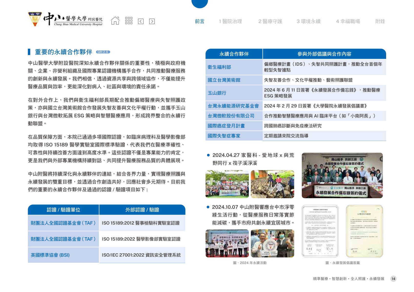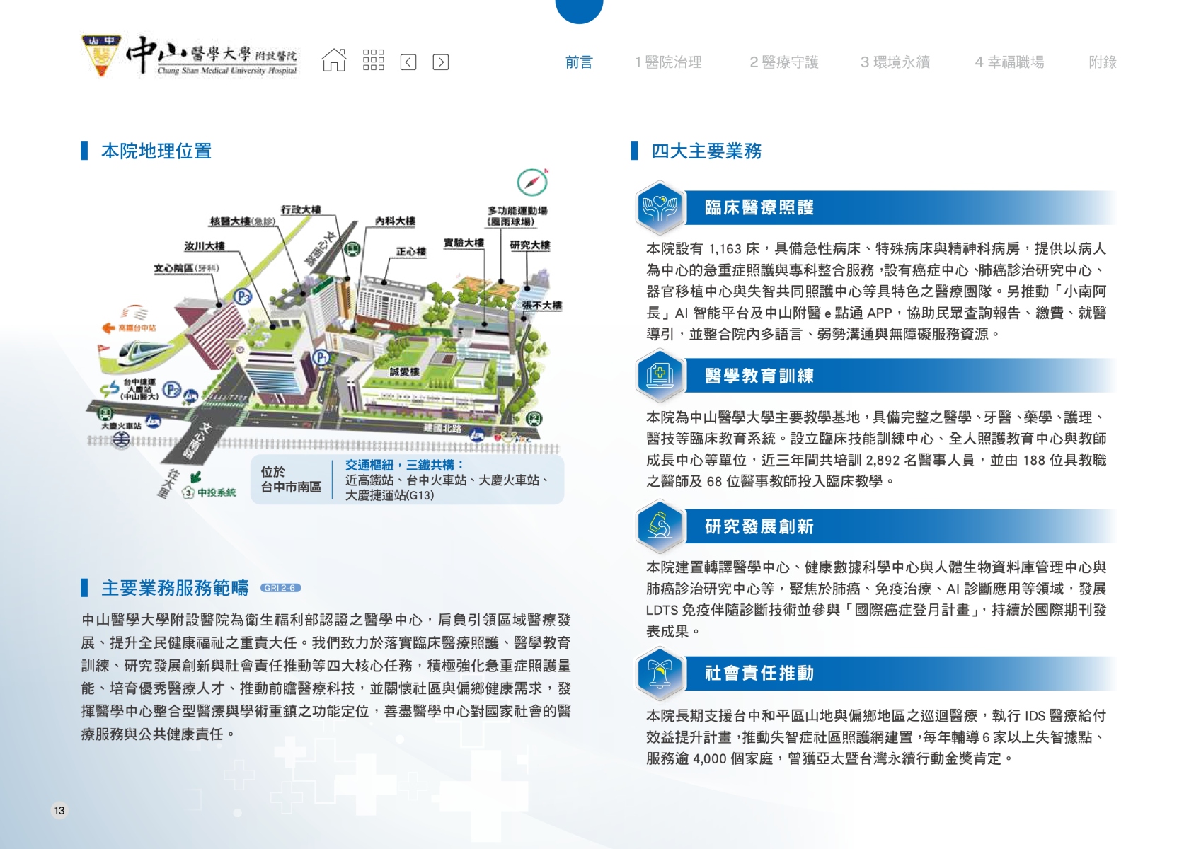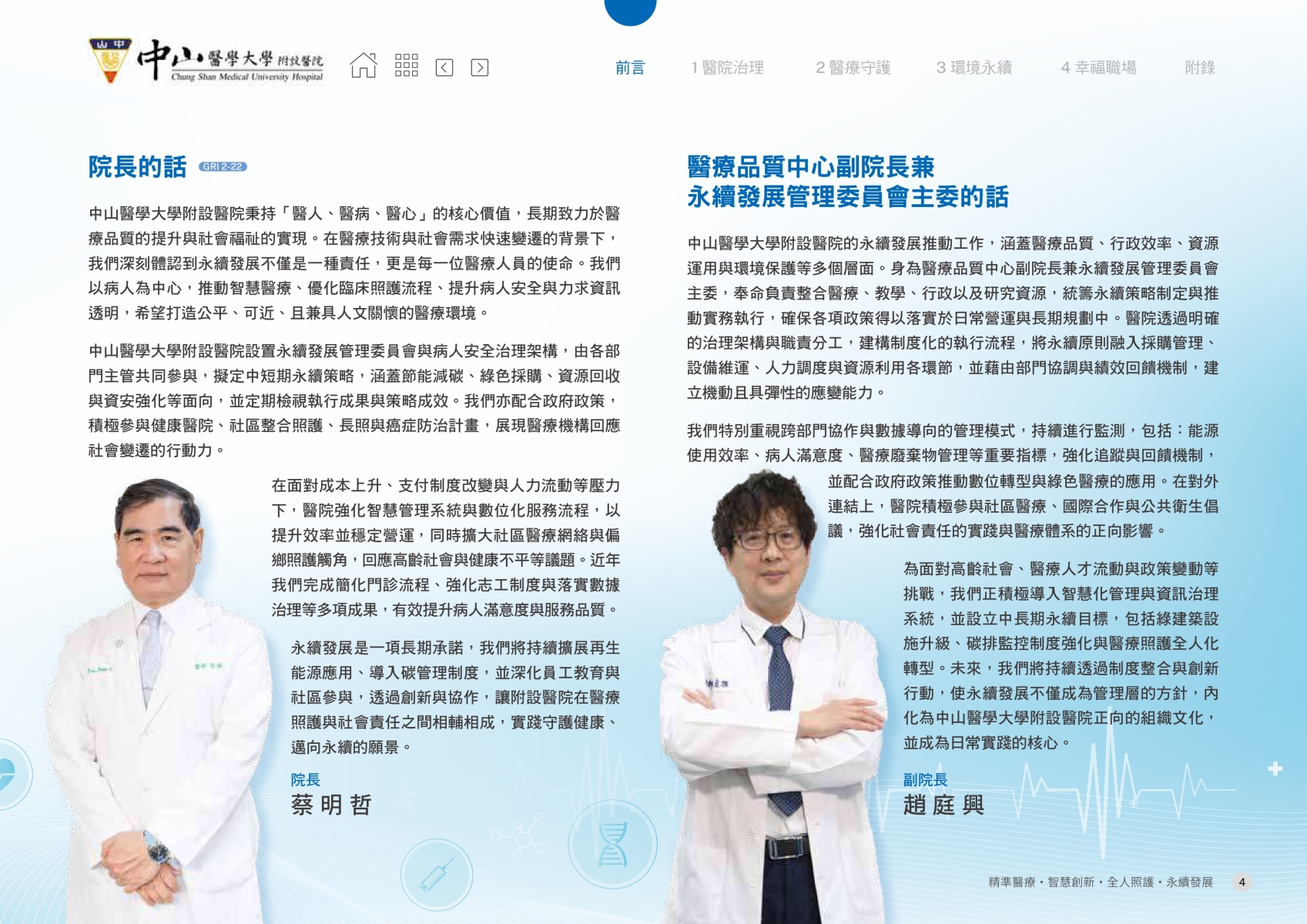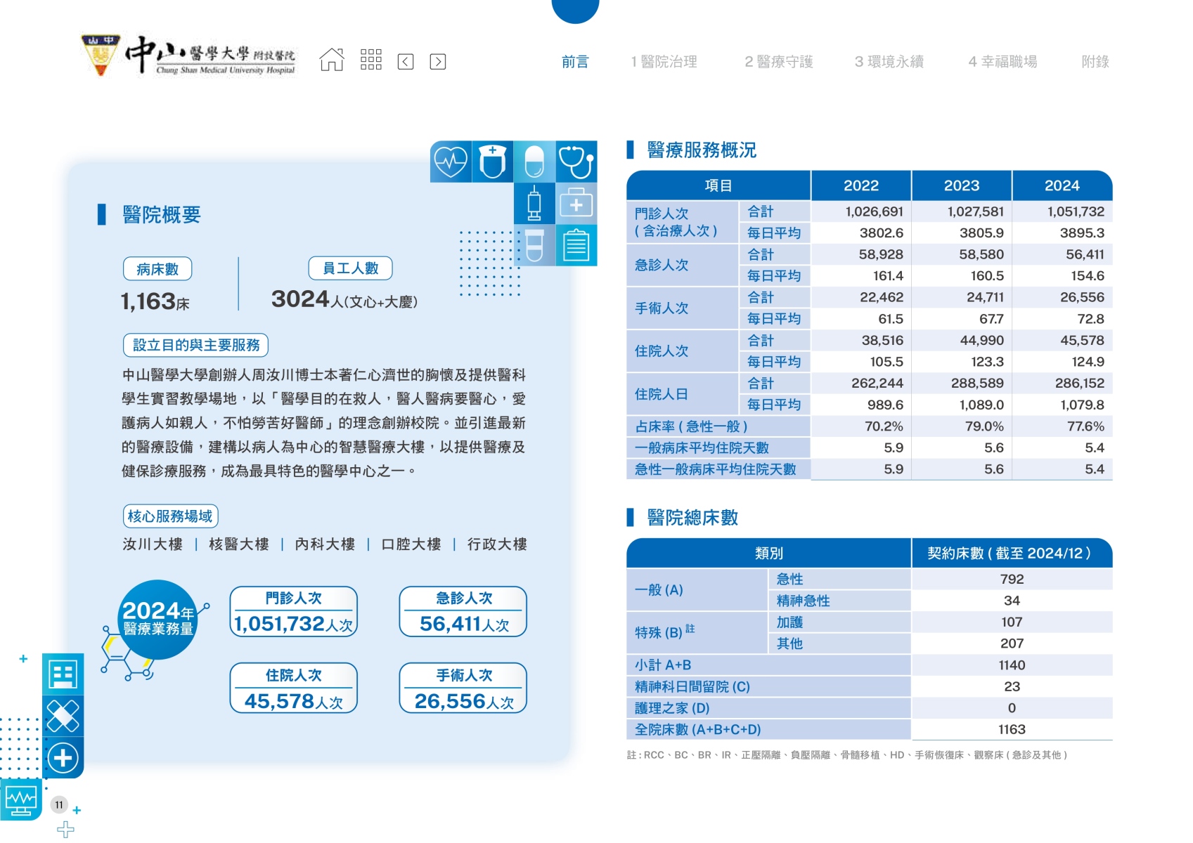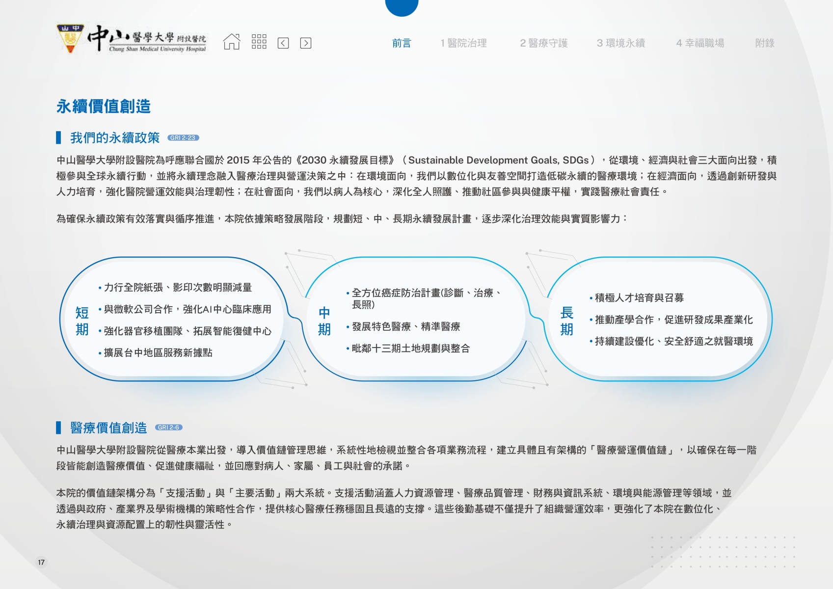 中山醫學大學附設醫院於2024年首次發行永續報告書,秉持「醫人、醫病、醫心」之宗旨,落實「關懷、承諾、 創新」的永續理念。期藉報告書作為與利害關係人溝通之平台,透過資訊透明揭露,使各界更深入瞭解本院之永續理念、策略與實踐作為。 未來將每二年定期發行,持續揭露本院於經濟、環境與社會三大面向之推動進展與績效成果。 報告書下載 ✔ 快速瀏覽tip:因報告書檔案較大,如有開啟緩慢情況,可於報告書下載處→按右鍵→另存連結為→存檔,即可順利下載瀏覽。也可點選下方圖片直接查看內容喔~ 1 2 ... 5 ► 2024 永續報告書