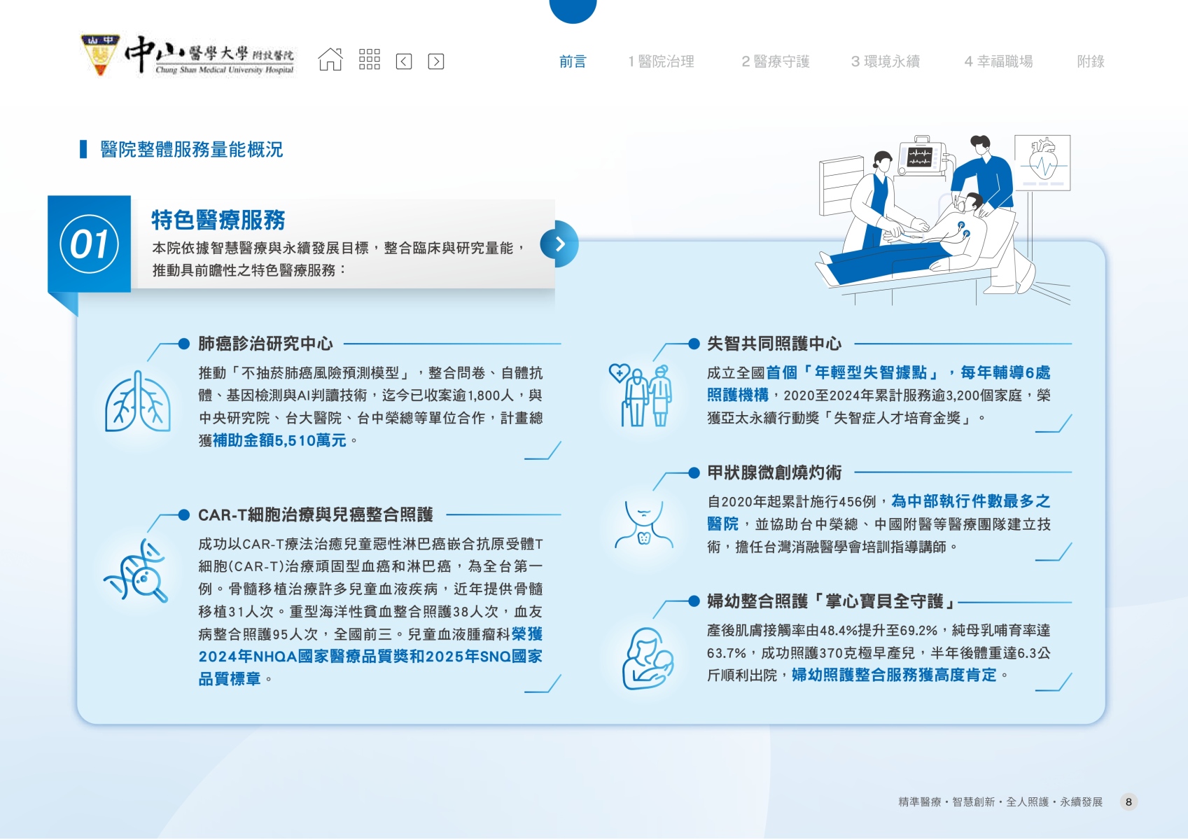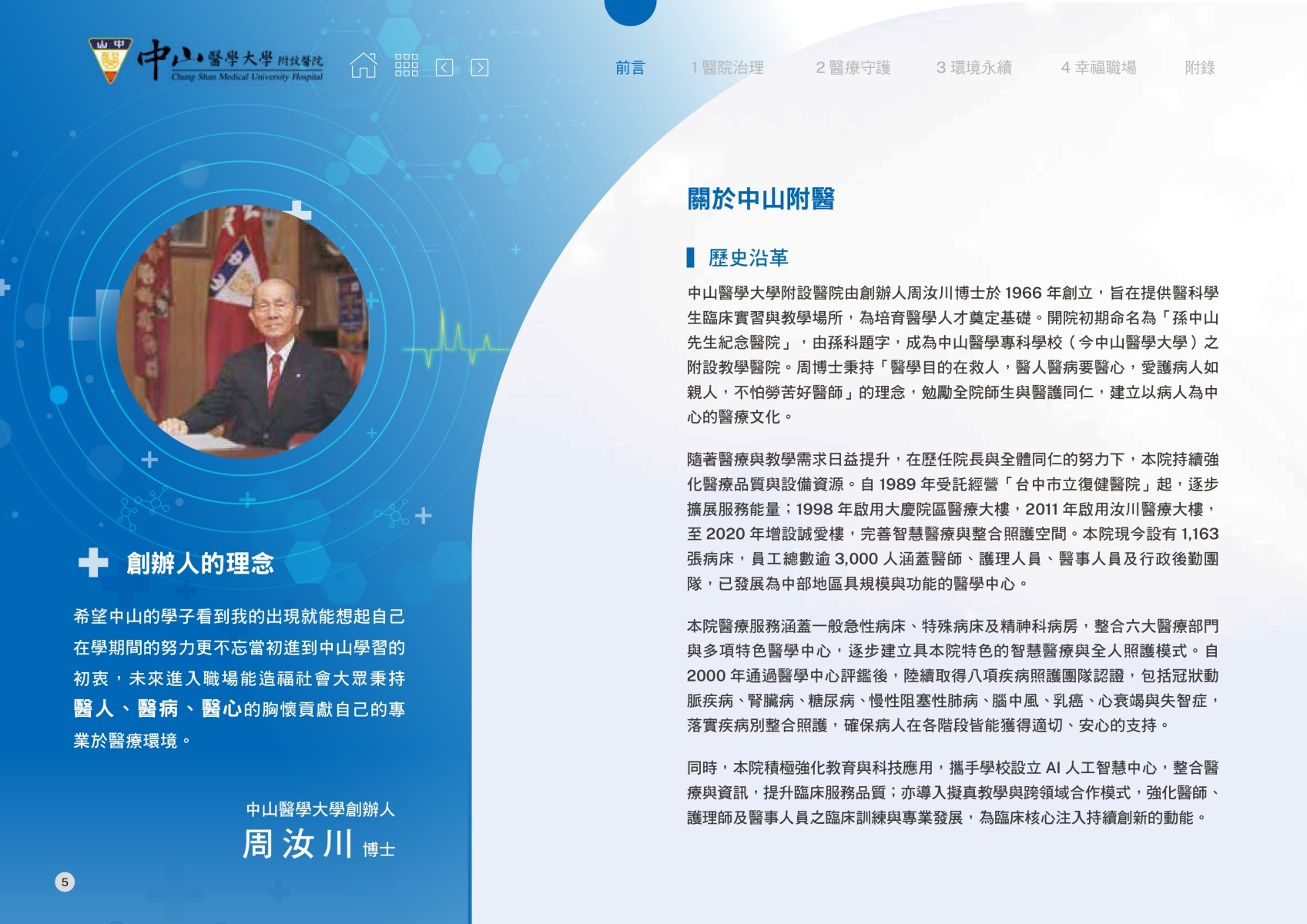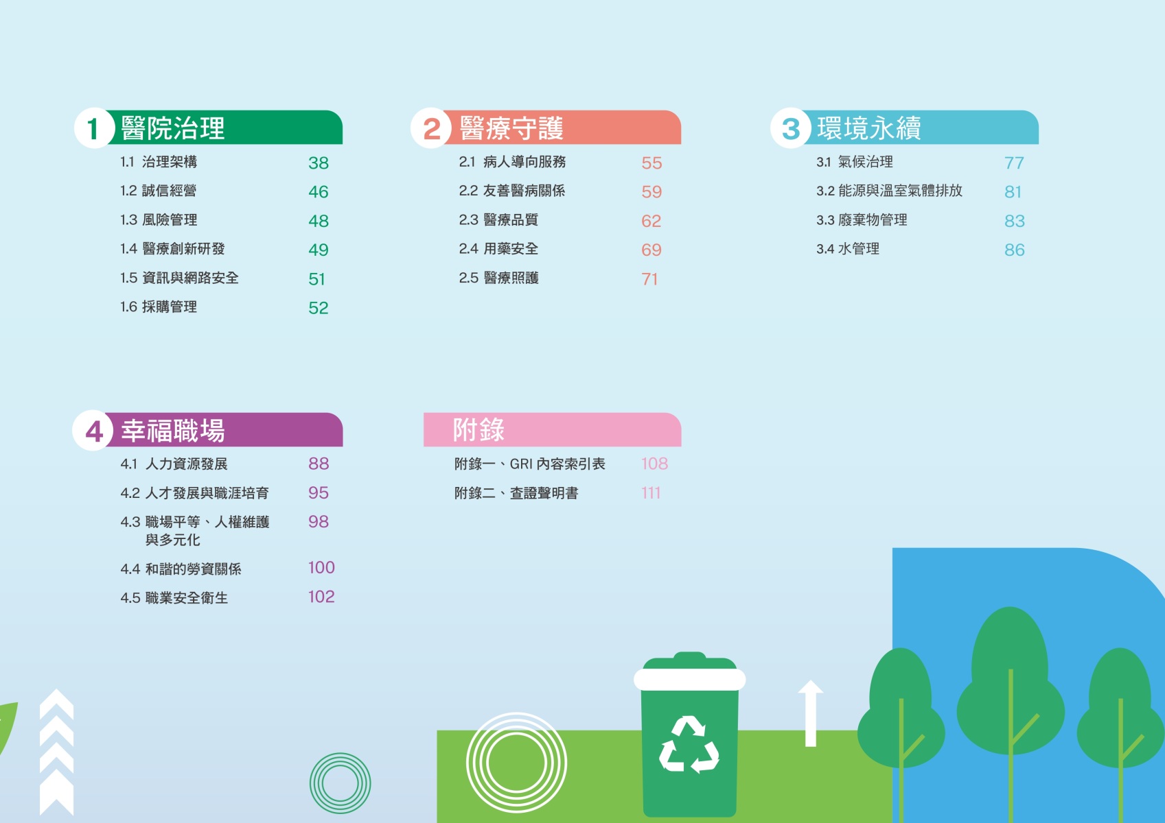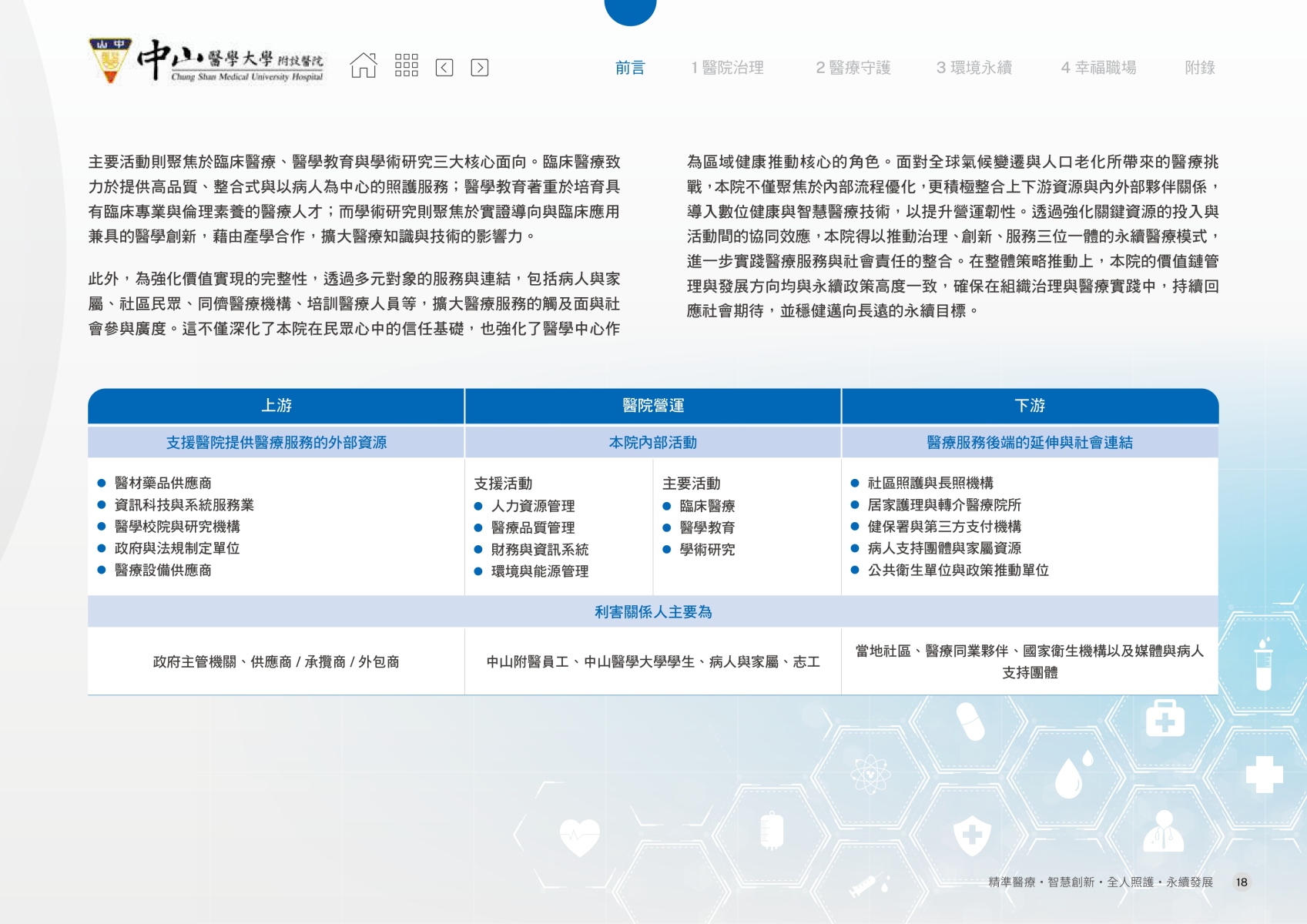 中山醫學大學附設醫院於2024年首次發行永續報告書,秉持「醫人、醫病、醫心」之宗旨,落實「關懷、承諾、 創新」的永續理念。期藉報告書作為與利害關係人溝通之平台,透過資訊透明揭露,使各界更深入瞭解本院之永續理念、策略與實踐作為。 未來將每二年定期發行,持續揭露本院於經濟、環境與社會三大面向之推動進展與績效成果。 報告書下載 ✔ 快速瀏覽tip:因報告書檔案較大,如有開啟緩慢情況,可於報告書下載處→按右鍵→另存連結為→存檔,即可順利下載瀏覽。也可點選下方圖片直接查看內容喔~ 1 2 ... 5 ► 2024 永續報告書
