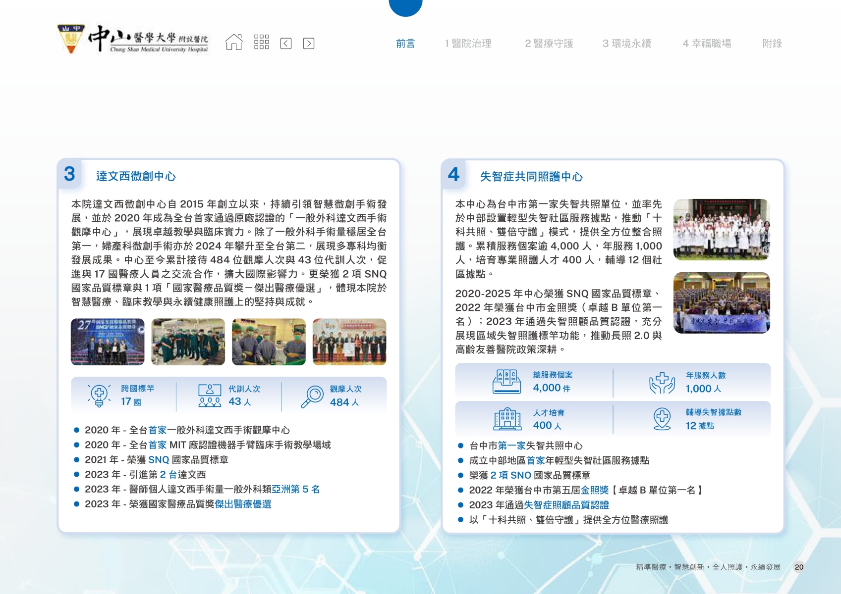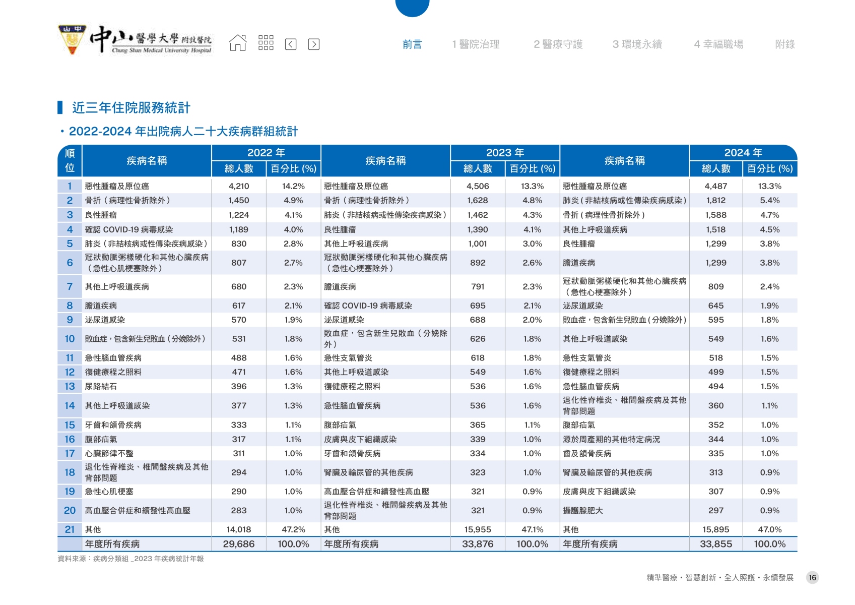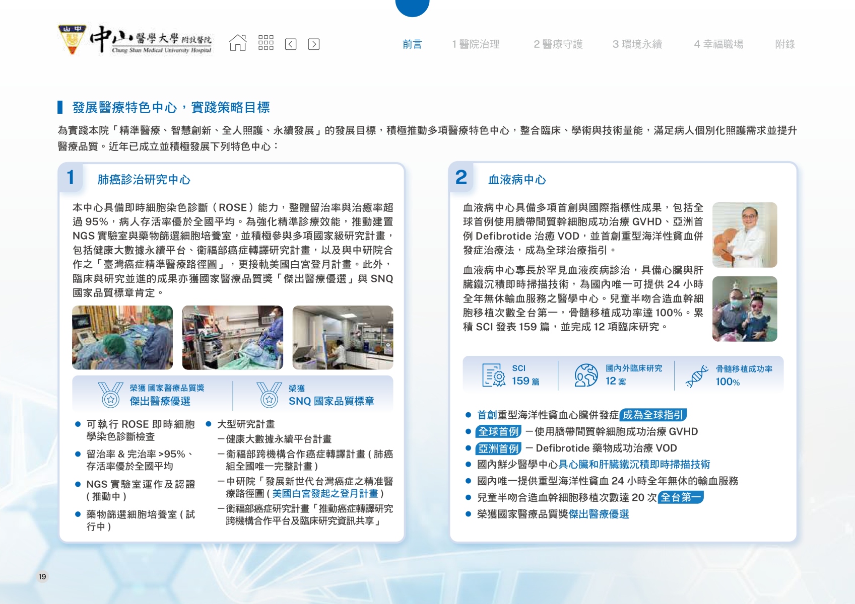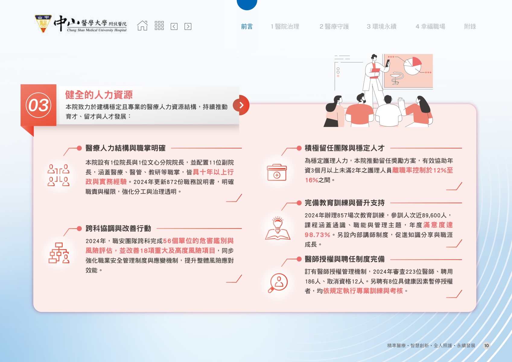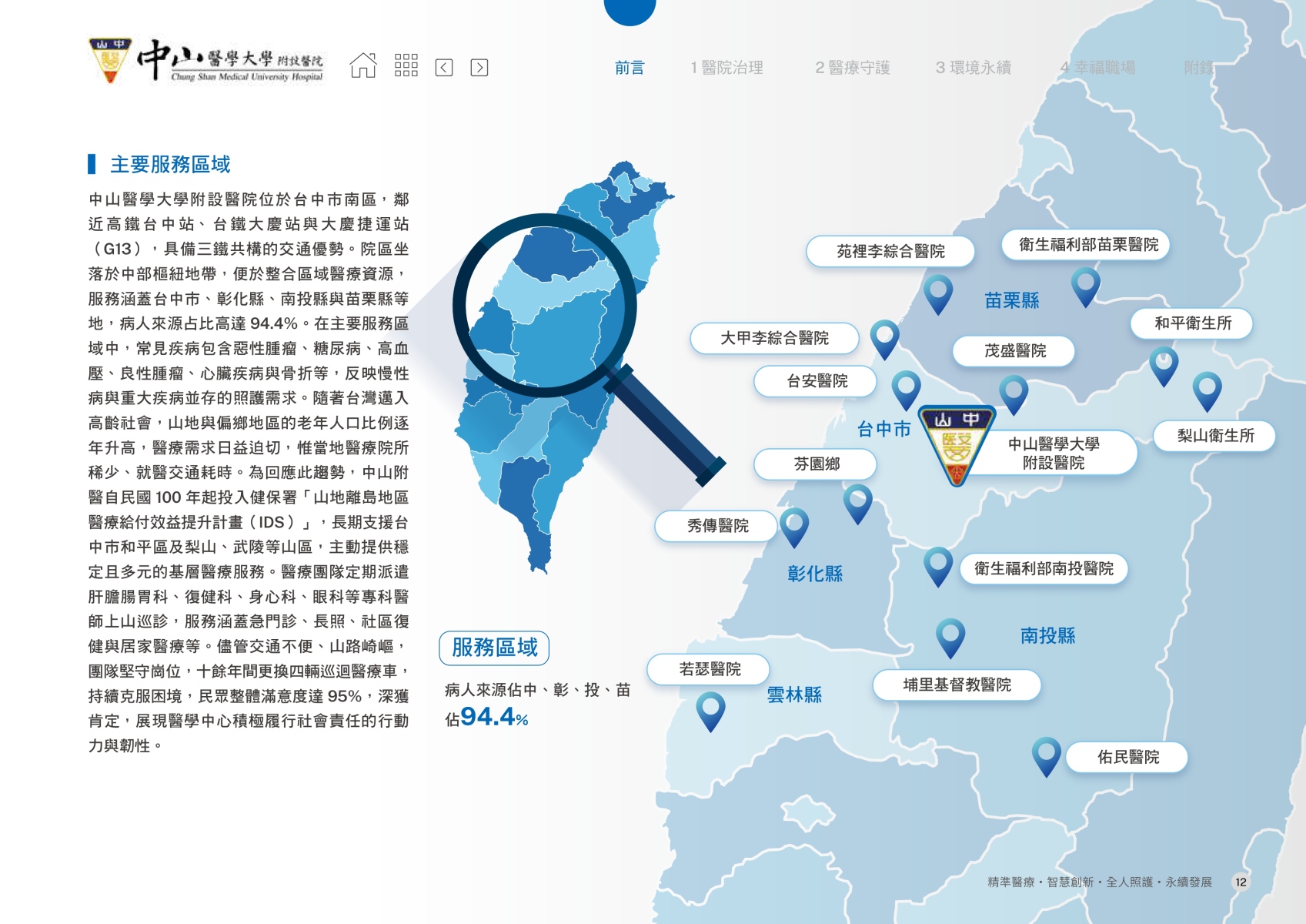 中山醫學大學附設醫院於2024年首次發行永續報告書,秉持「醫人、醫病、醫心」之宗旨,落實「關懷、承諾、 創新」的永續理念。期藉報告書作為與利害關係人溝通之平台,透過資訊透明揭露,使各界更深入瞭解本院之永續理念、策略與實踐作為。 未來將每二年定期發行,持續揭露本院於經濟、環境與社會三大面向之推動進展與績效成果。 報告書下載 ✔ 快速瀏覽tip:因報告書檔案較大,如有開啟緩慢情況,可於報告書下載處→按右鍵→另存連結為→存檔,即可順利下載瀏覽。也可點選下方圖片直接查看內容喔~ 1 2 ... 5 ► 2024 永續報告書