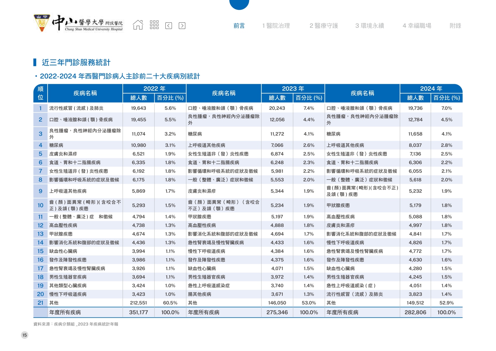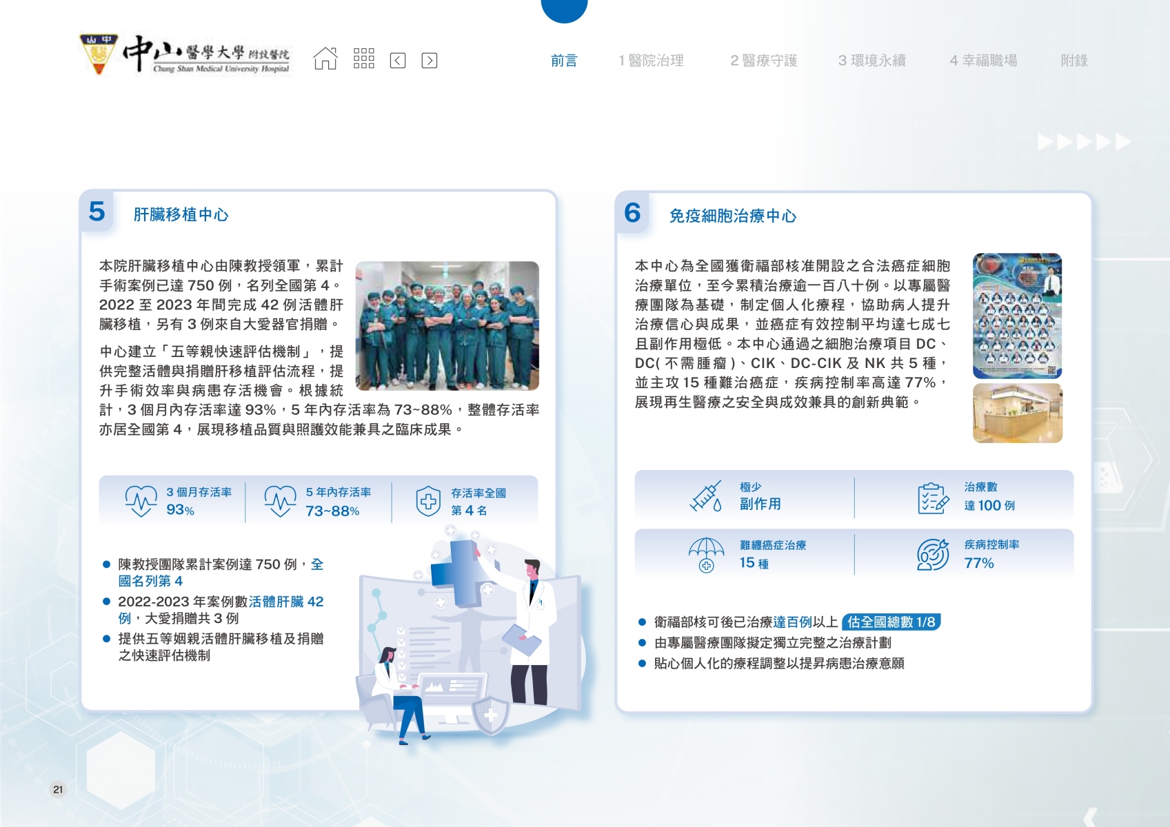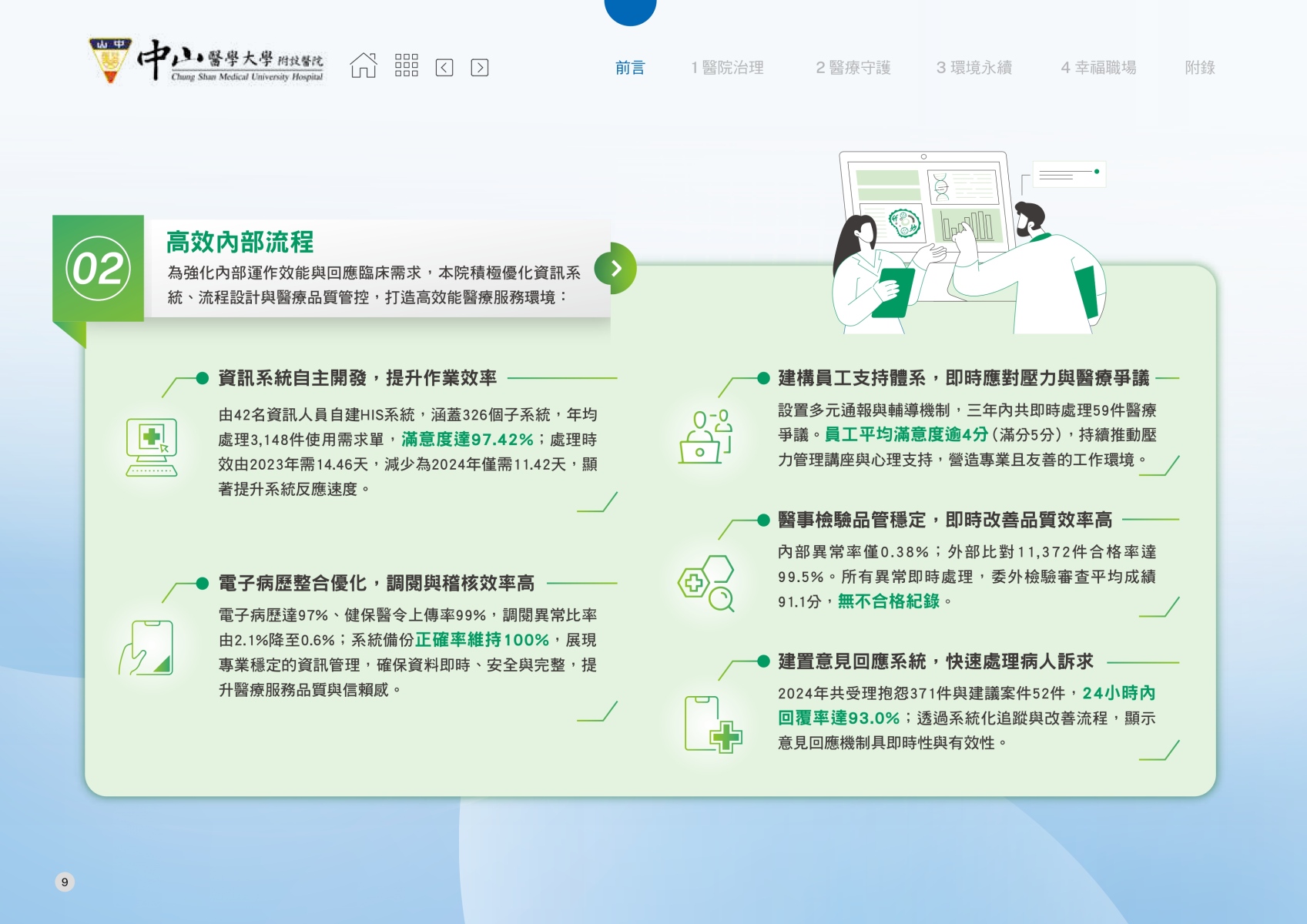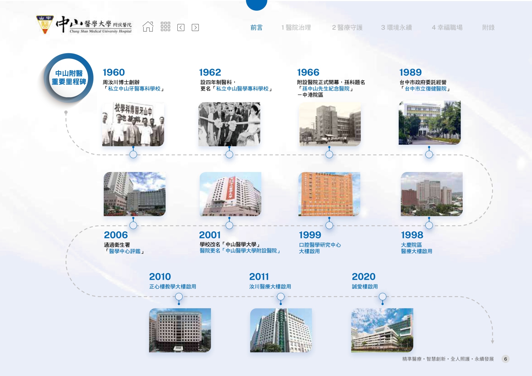 中山醫學大學附設醫院於2024年首次發行永續報告書,秉持「醫人、醫病、醫心」之宗旨,落實「關懷、承諾、 創新」的永續理念。期藉報告書作為與利害關係人溝通之平台,透過資訊透明揭露,使各界更深入瞭解本院之永續理念、策略與實踐作為。 未來將每二年定期發行,持續揭露本院於經濟、環境與社會三大面向之推動進展與績效成果。 報告書下載 ✔ 快速瀏覽tip:因報告書檔案較大,如有開啟緩慢情況,可於報告書下載處→按右鍵→另存連結為→存檔,即可順利下載瀏覽。也可點選下方圖片直接查看內容喔~ 1 2 ... 5 ► 2024 永續報告書