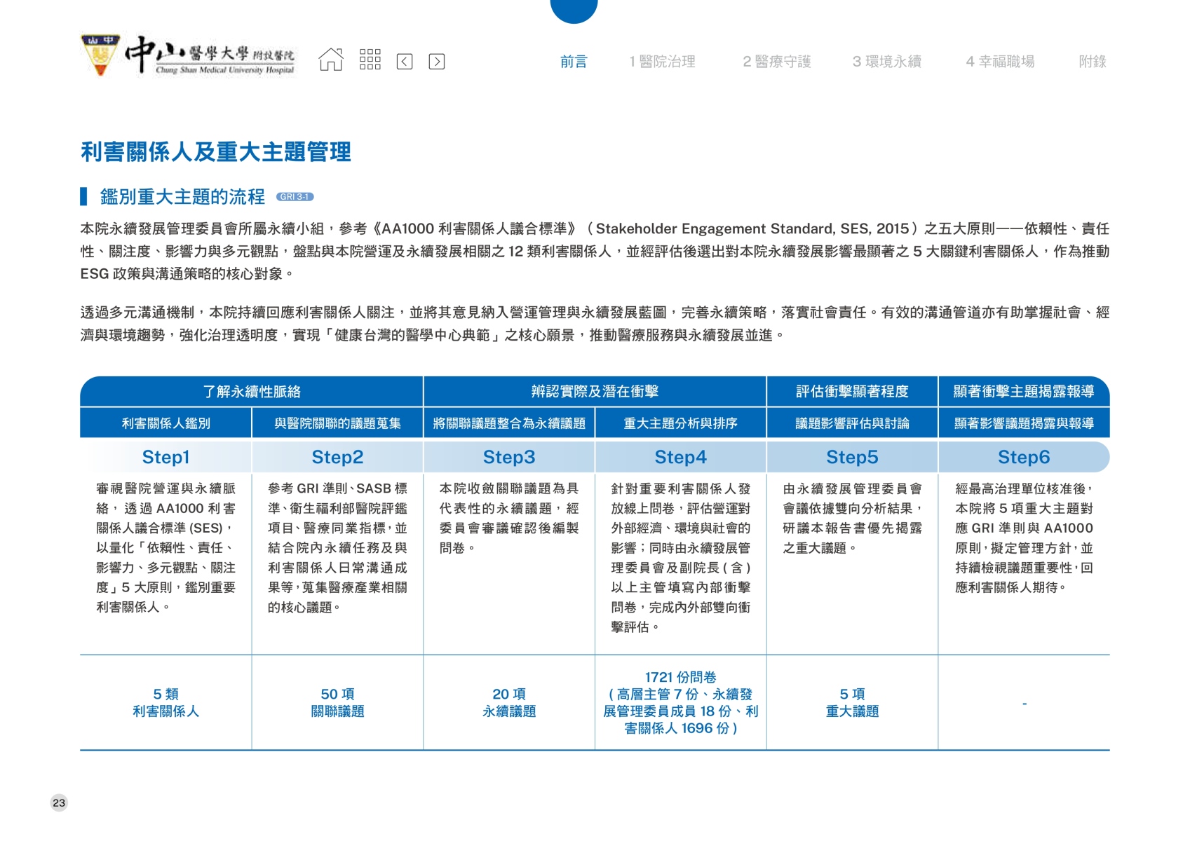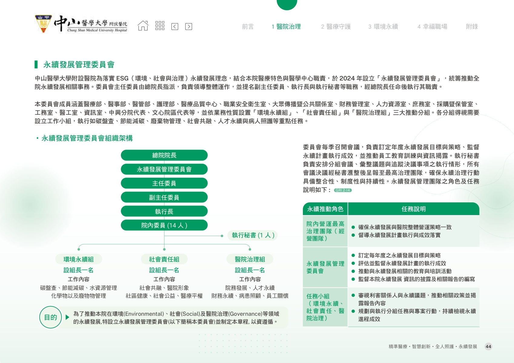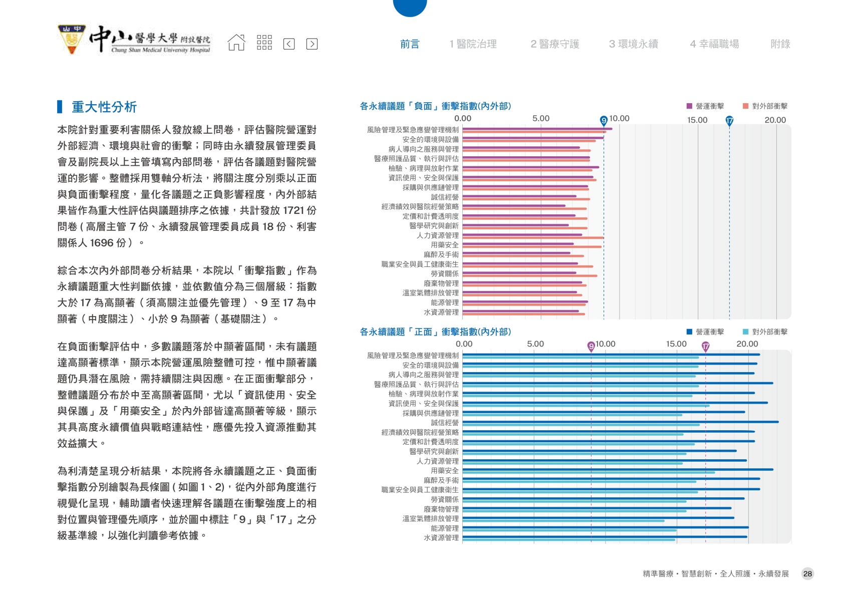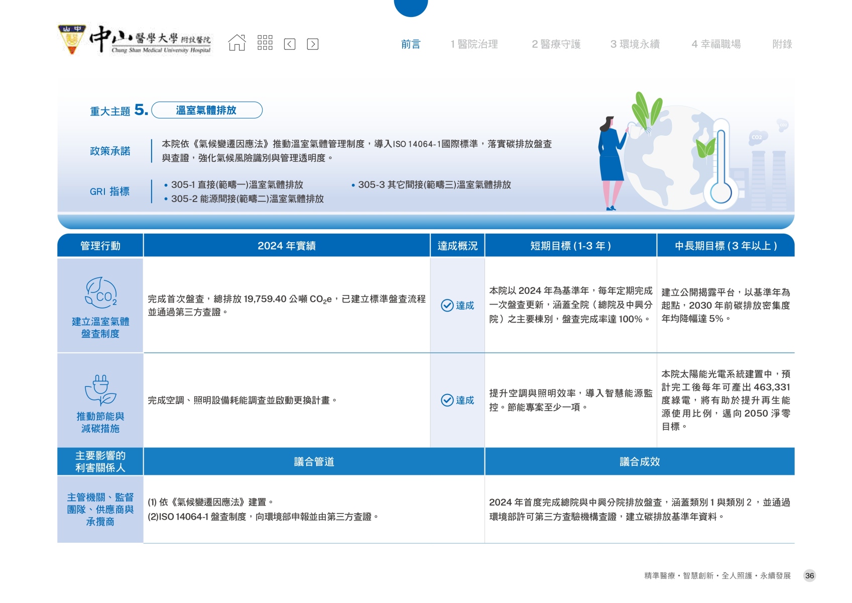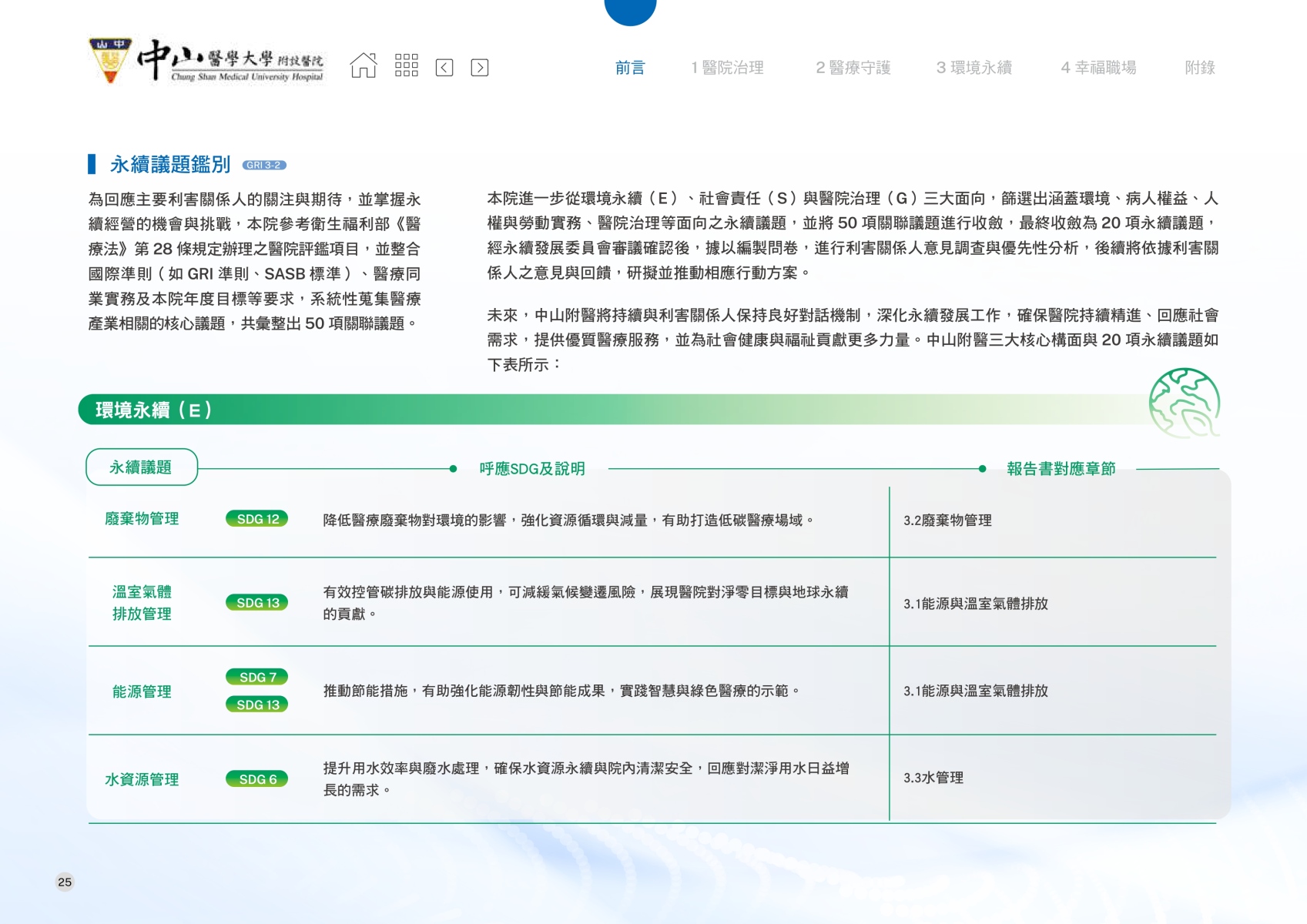中山醫學大學附設醫院於2024年首次發行永續報告書,秉持「醫人、醫病、醫心」之宗旨,落實「關懷、承諾、 創新」的永續理念。期藉報告書作為與利害關係人溝通之平台,透過資訊透明揭露,使各界更深入瞭解本院之永續理念、策略與實踐作為。 未來將每二年定期發行,持續揭露本院於經濟、環境與社會三大面向之推動進展與績效成果。 報告書下載 ✔ 快速瀏覽tip:因報告書檔案較大,如有開啟緩慢情況,可於報告書下載處→按右鍵→另存連結為→存檔,即可順利下載瀏覽。也可點選下方圖片直接查看內容喔~ ◄ 1 2 3 ... 5 ► 2024 永續報告書