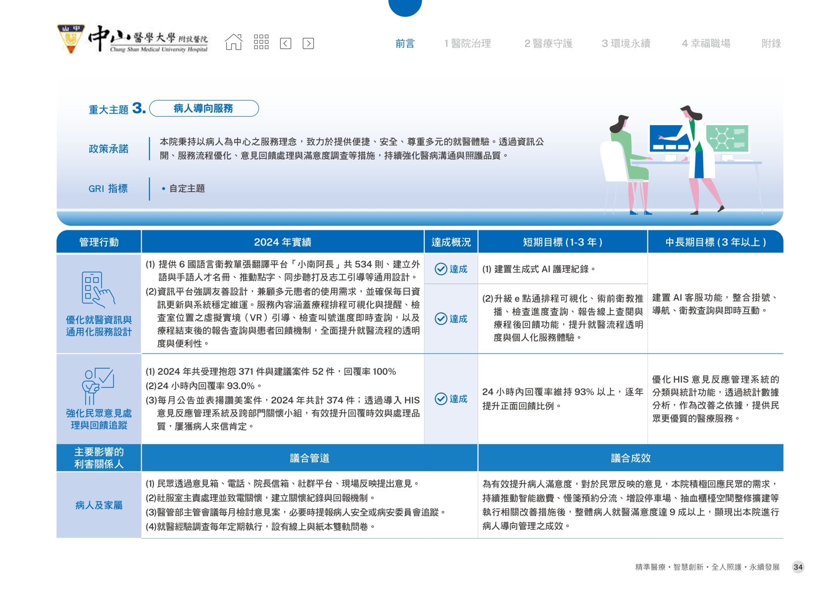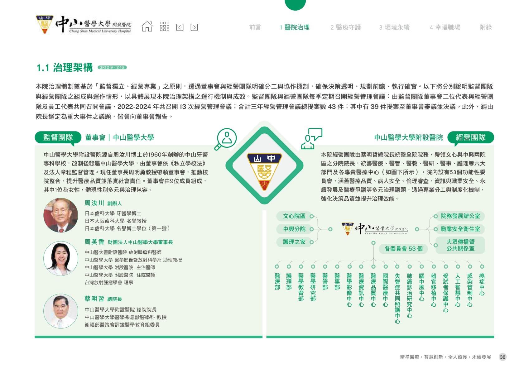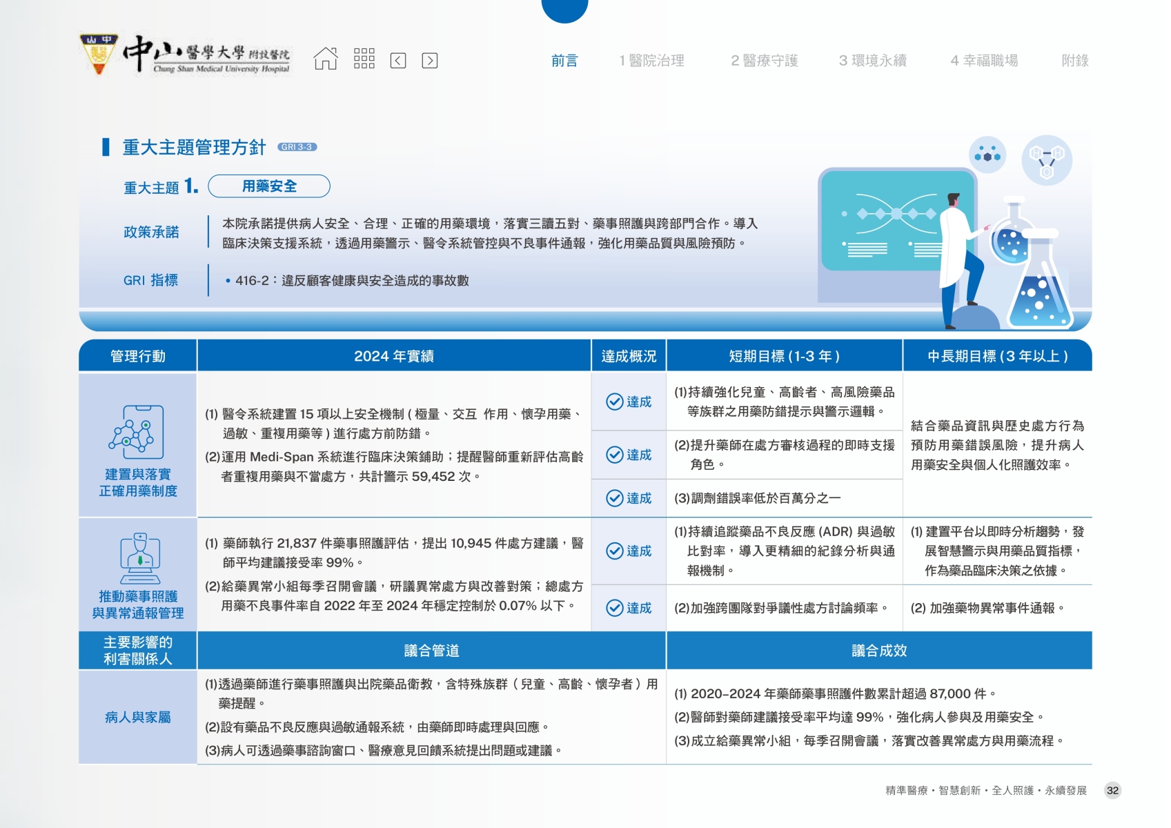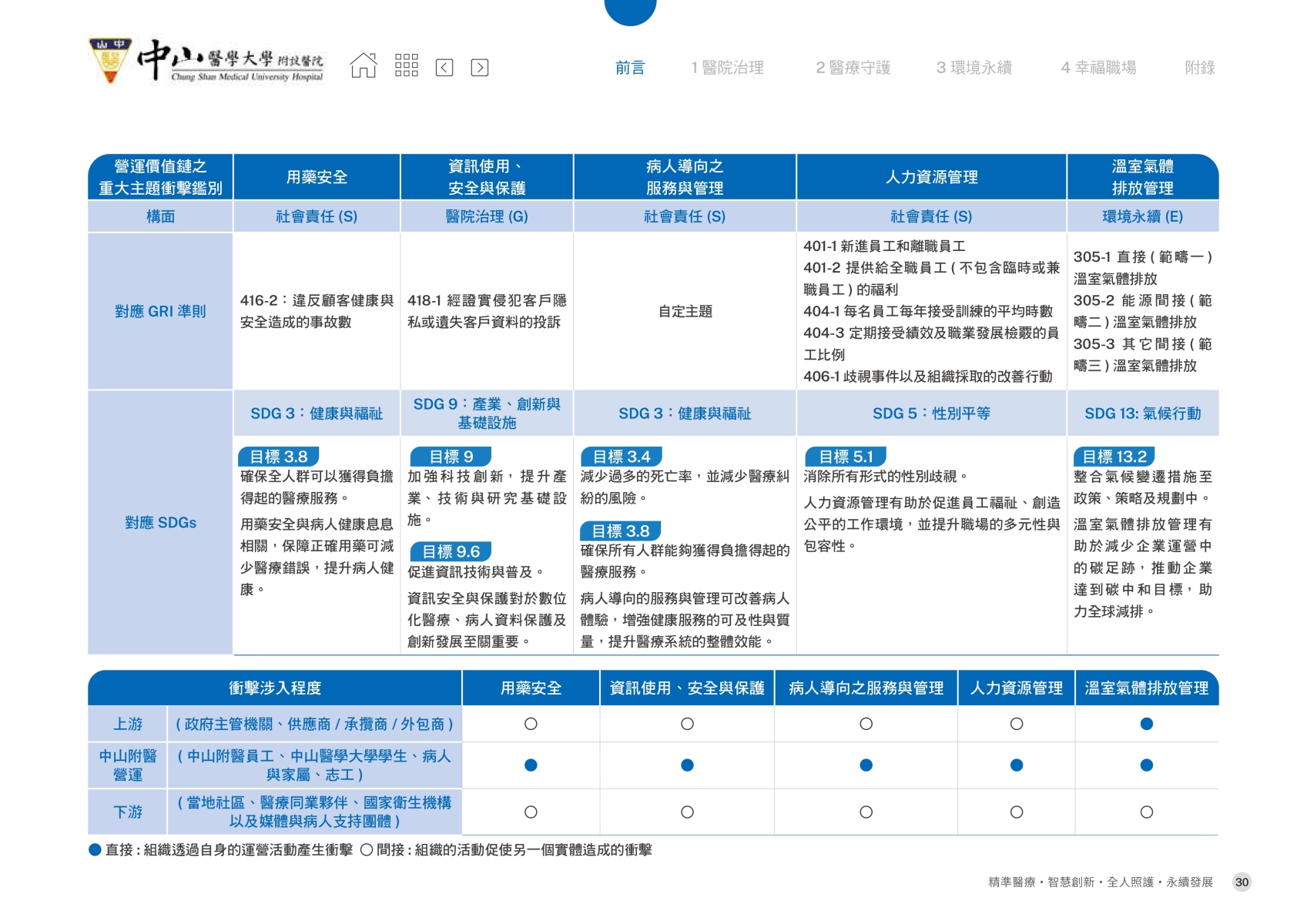 中山醫學大學附設醫院於2024年首次發行永續報告書,秉持「醫人、醫病、醫心」之宗旨,落實「關懷、承諾、 創新」的永續理念。期藉報告書作為與利害關係人溝通之平台,透過資訊透明揭露,使各界更深入瞭解本院之永續理念、策略與實踐作為。 未來將每二年定期發行,持續揭露本院於經濟、環境與社會三大面向之推動進展與績效成果。 報告書下載 ✔ 快速瀏覽tip:因報告書檔案較大,如有開啟緩慢情況,可於報告書下載處→按右鍵→另存連結為→存檔,即可順利下載瀏覽。也可點選下方圖片直接查看內容喔~ ◄ 1 2 3 ... 5 ► 2024 永續報告書