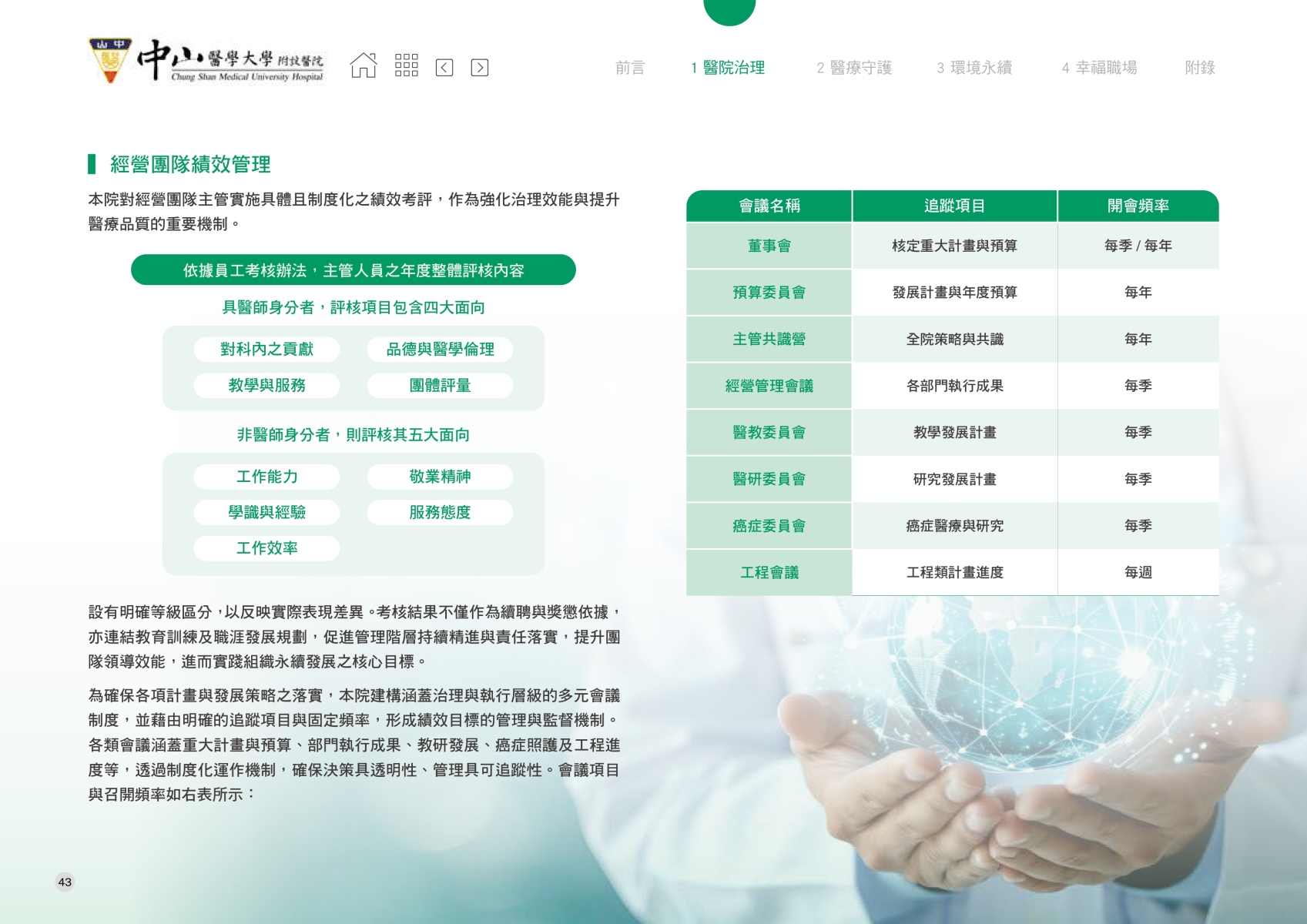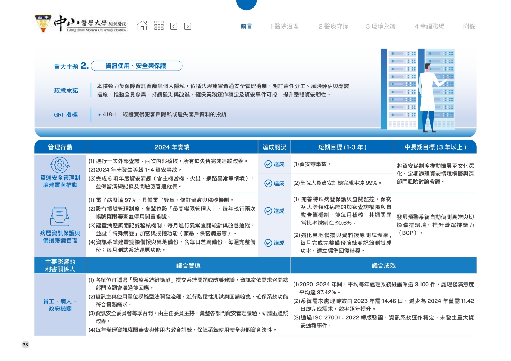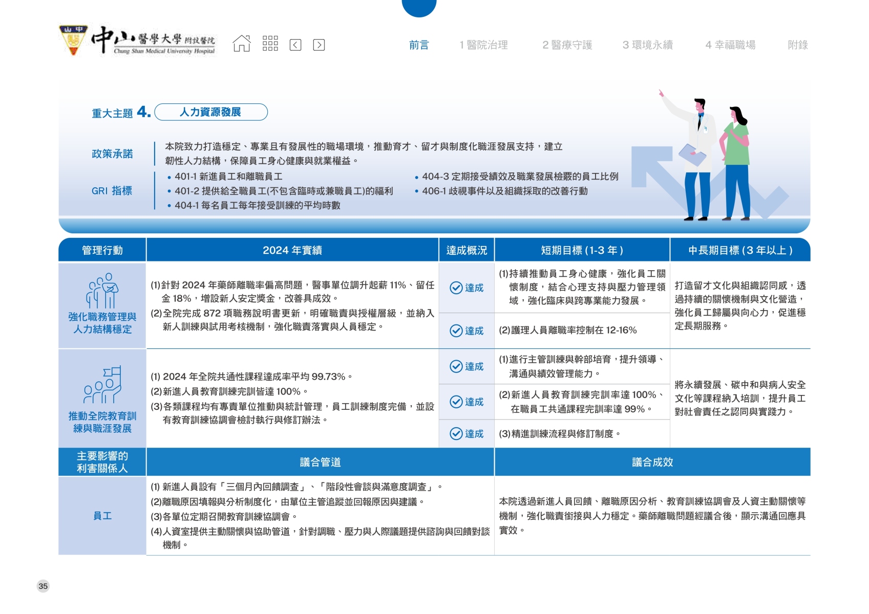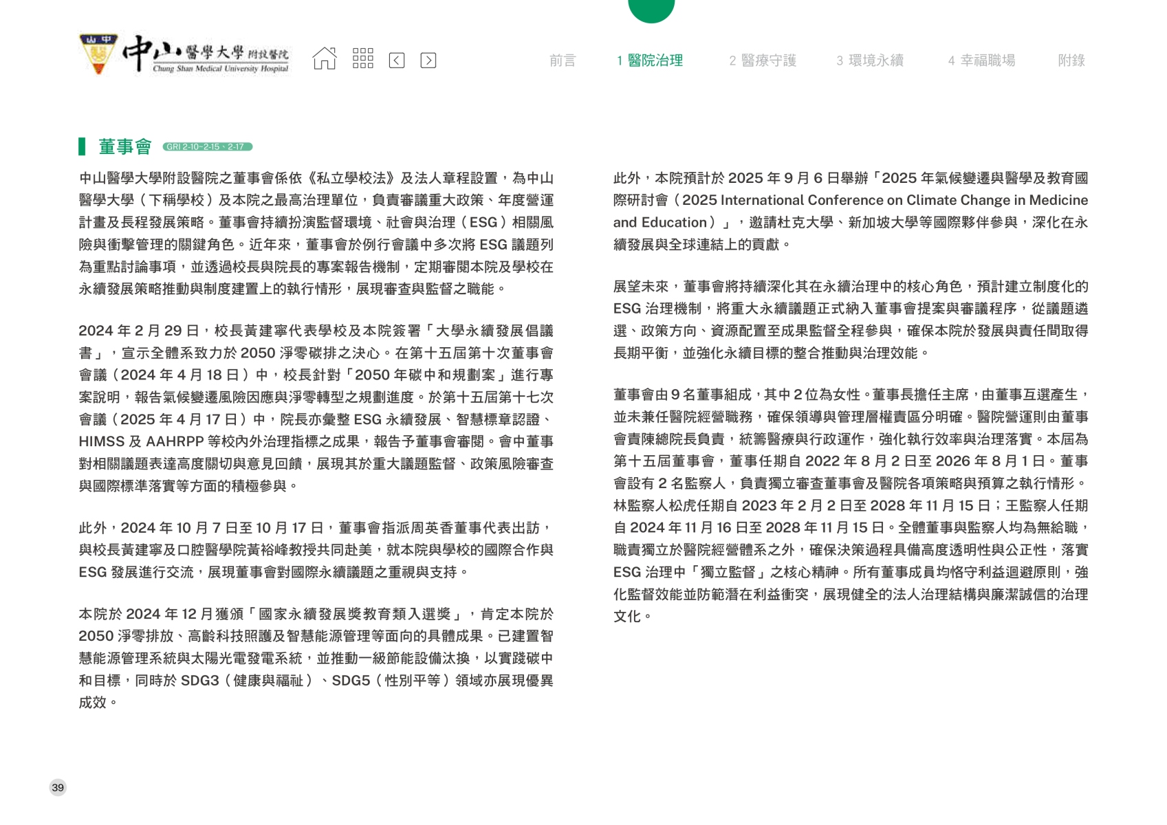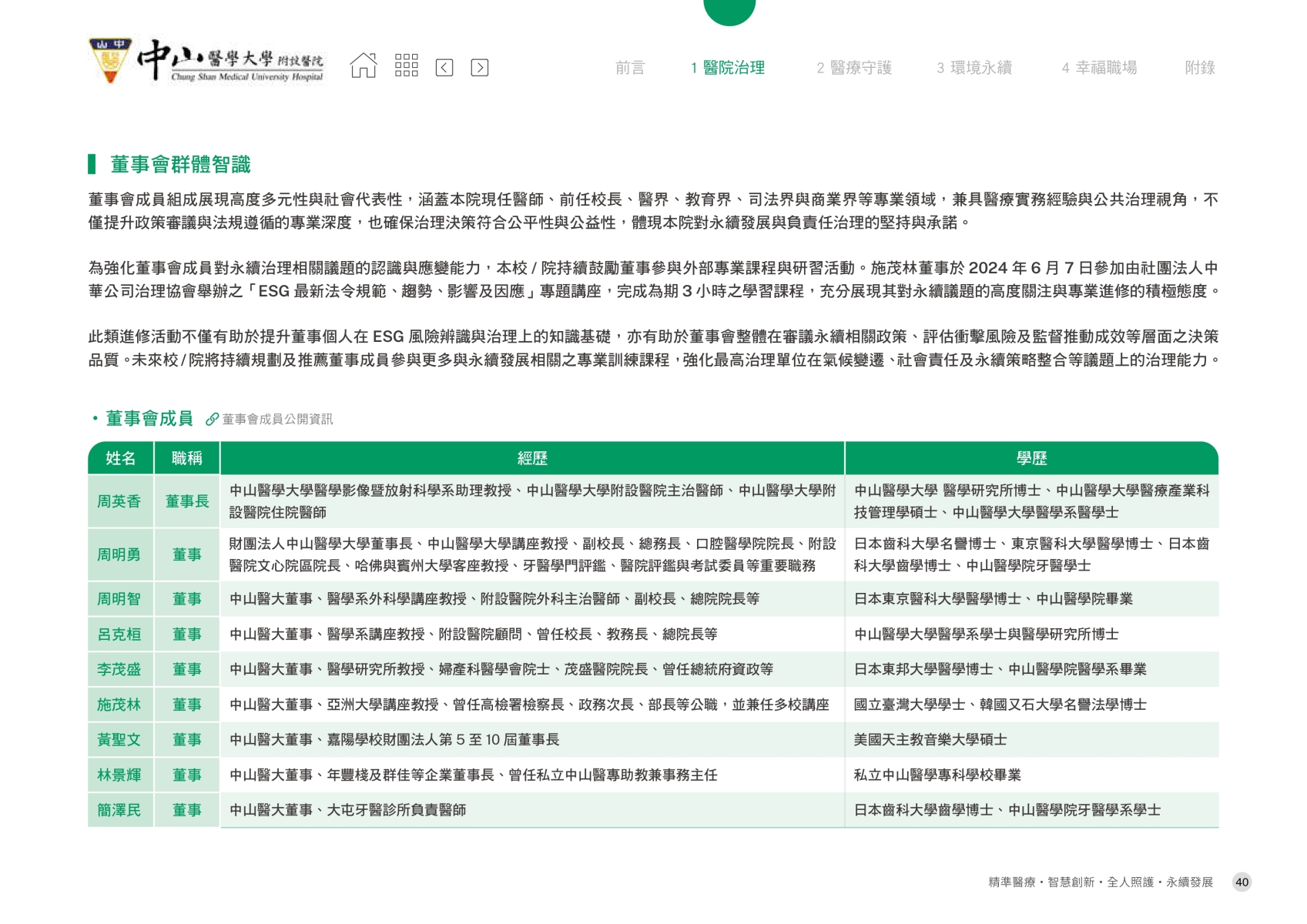 中山醫學大學附設醫院於2024年首次發行永續報告書,秉持「醫人、醫病、醫心」之宗旨,落實「關懷、承諾、 創新」的永續理念。期藉報告書作為與利害關係人溝通之平台,透過資訊透明揭露,使各界更深入瞭解本院之永續理念、策略與實踐作為。 未來將每二年定期發行,持續揭露本院於經濟、環境與社會三大面向之推動進展與績效成果。 報告書下載 ✔ 快速瀏覽tip:因報告書檔案較大,如有開啟緩慢情況,可於報告書下載處→按右鍵→另存連結為→存檔,即可順利下載瀏覽。也可點選下方圖片直接查看內容喔~ ◄ 1 2 3 ... 5 ► 2024 永續報告書