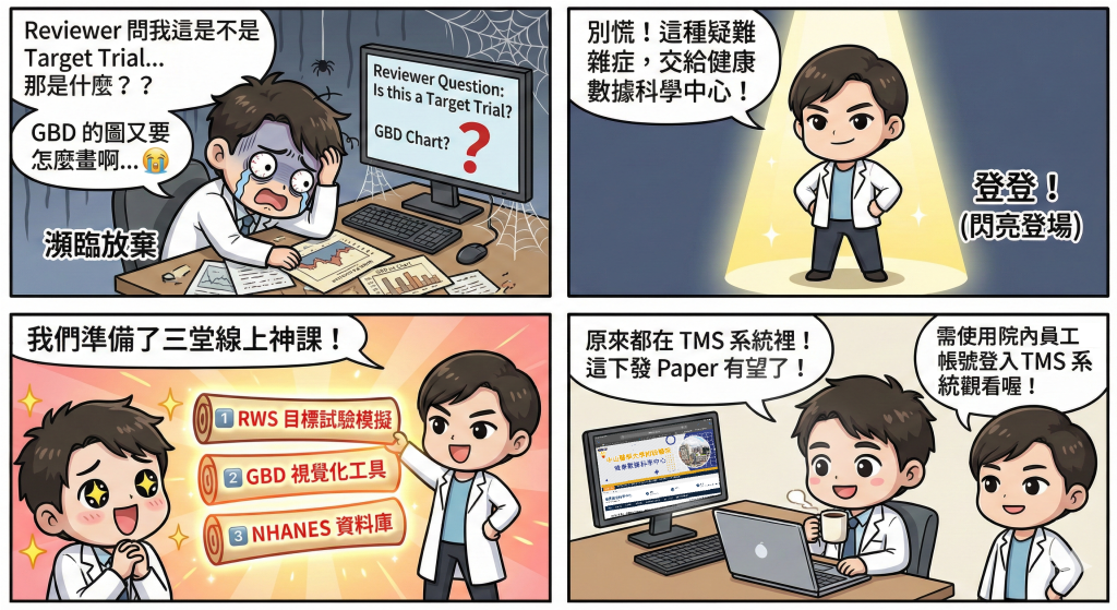 健康數據科學中心聽到大家的心聲了!我們將中心內部最受好評的教育訓練內容,轉化為隨點隨看的「線上課程」。由中心主任與資深分析師親自講授,不用請假、不用跑現場,用一杯咖啡的時間,升級您的數據戰鬥力!
