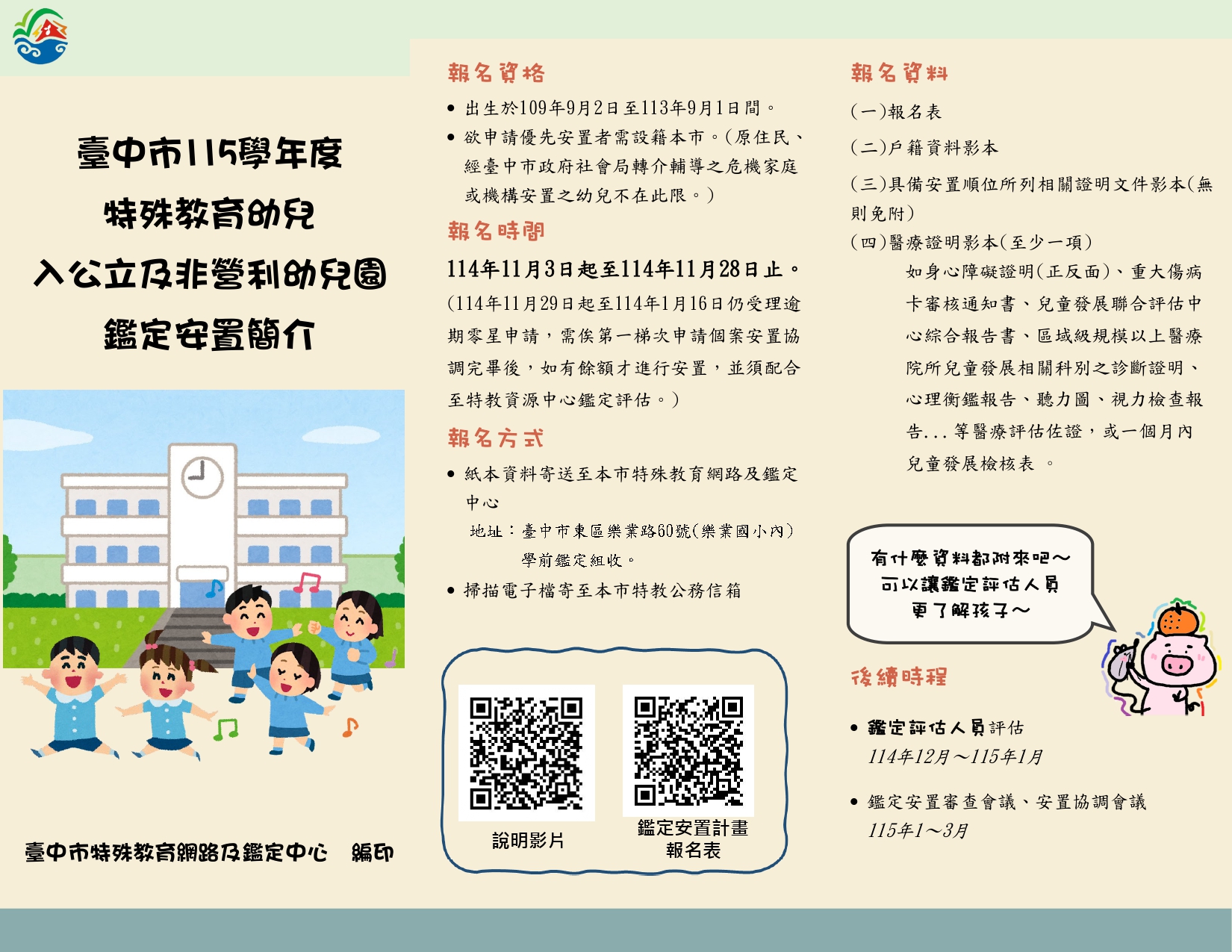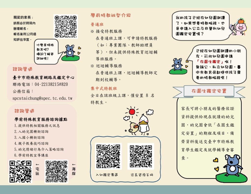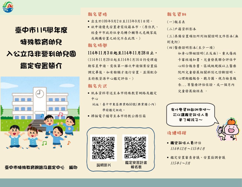 台中市學齡前特殊教育幼兒114學年度入公立及非營利幼兒園鑑定安置資訊