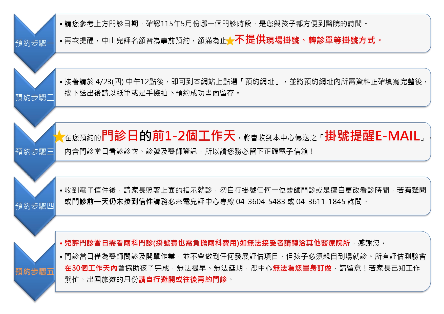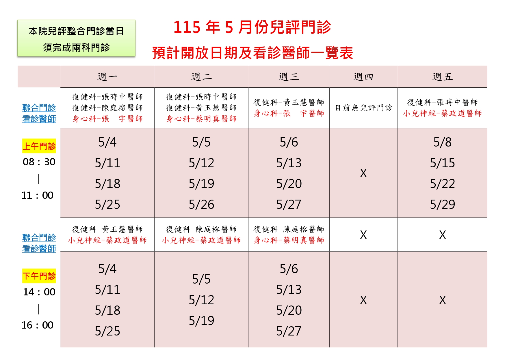 - 115年5月份兒童發展評估門診:115/4/23 (四) 中午12點開放
