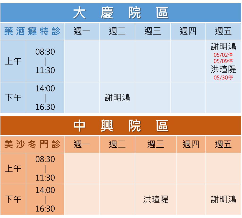 📆114/05月份藥酒癮門診表 門診表 2025-04-292025-05-14 N476Leave a Comment on 📆114/05月份藥酒癮門診表 ✨掛號請點我✨此門診位置在中興院區 (請點我)✨院址:402 台中市南區復興路二段11號✨總機:04-22621652 #70102