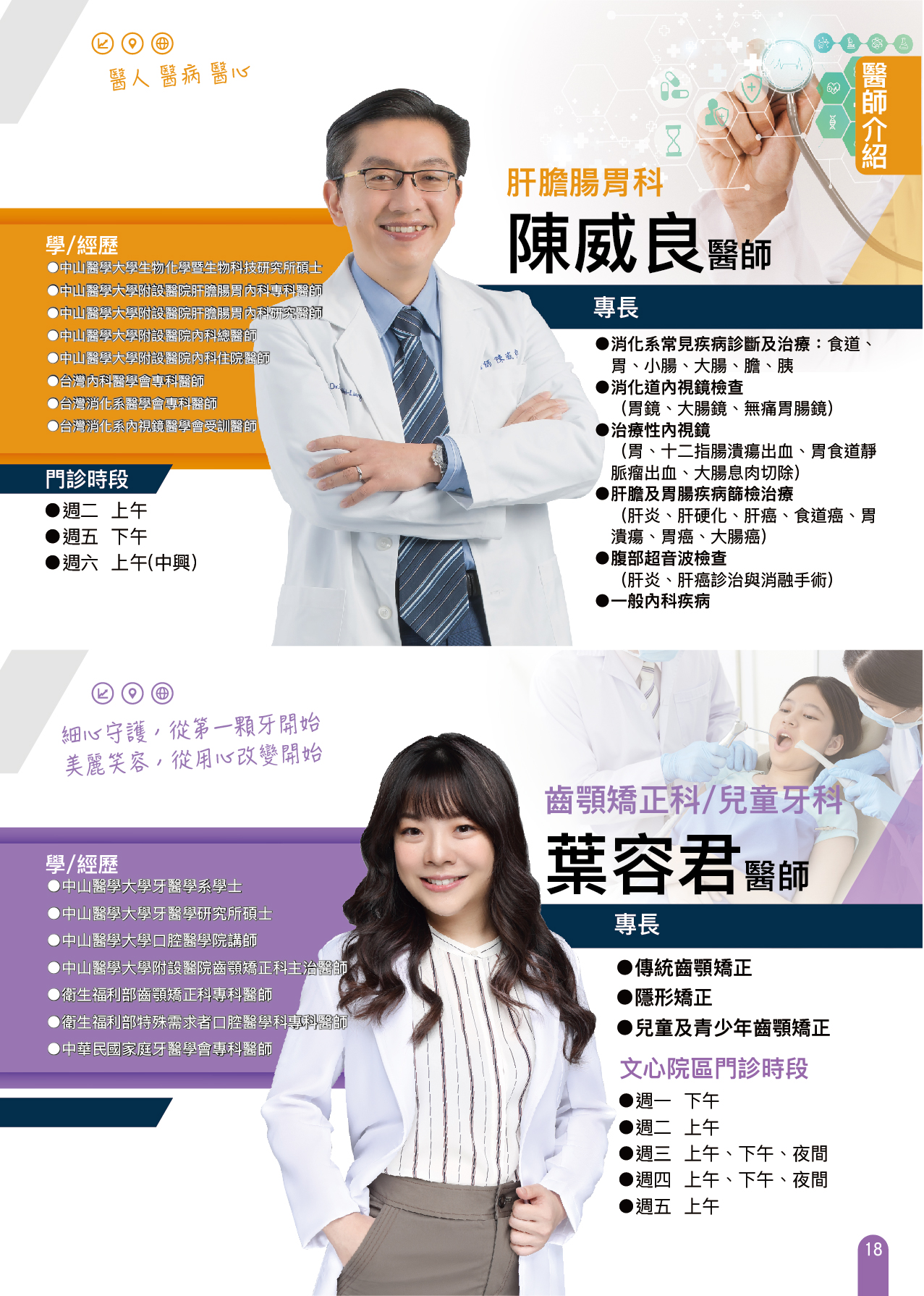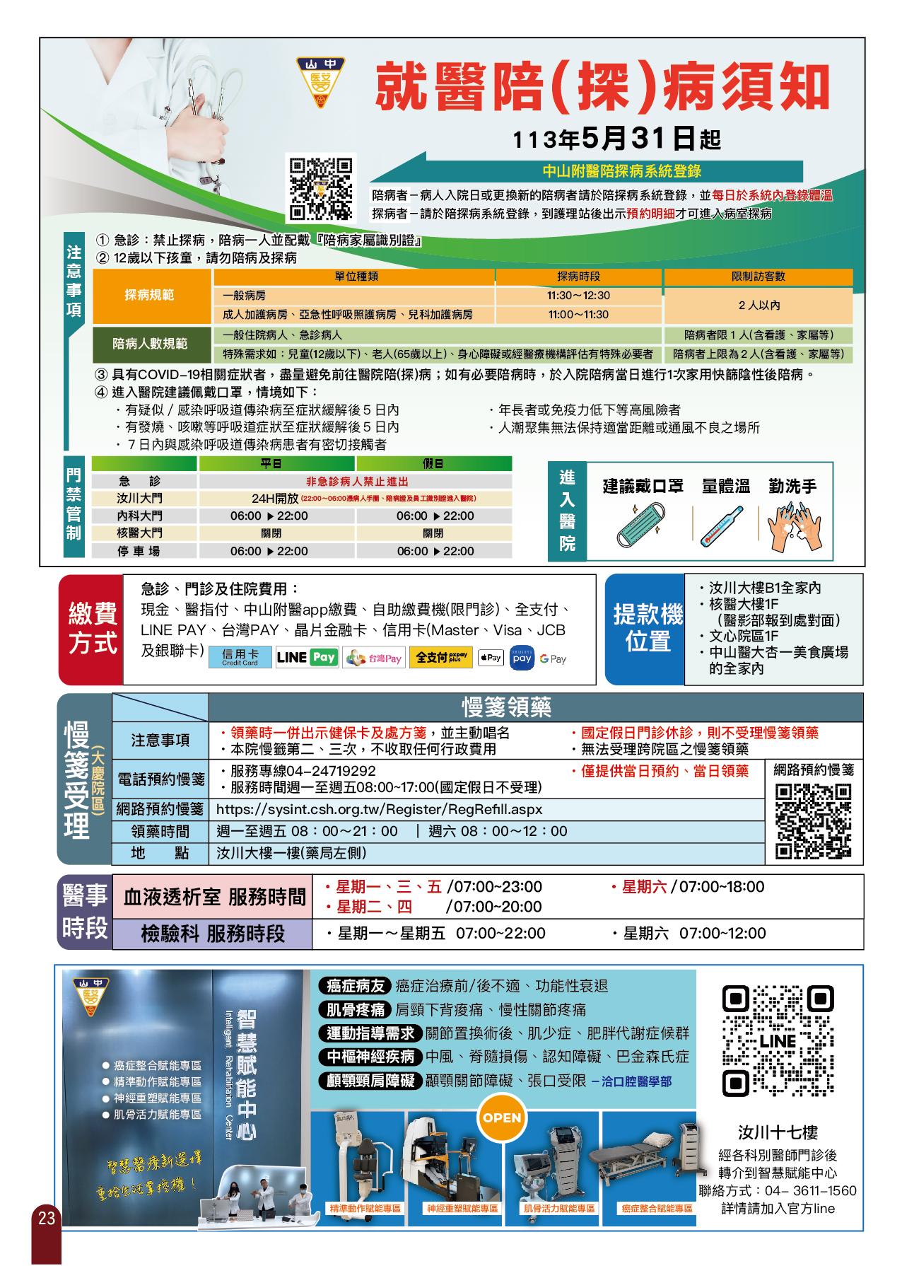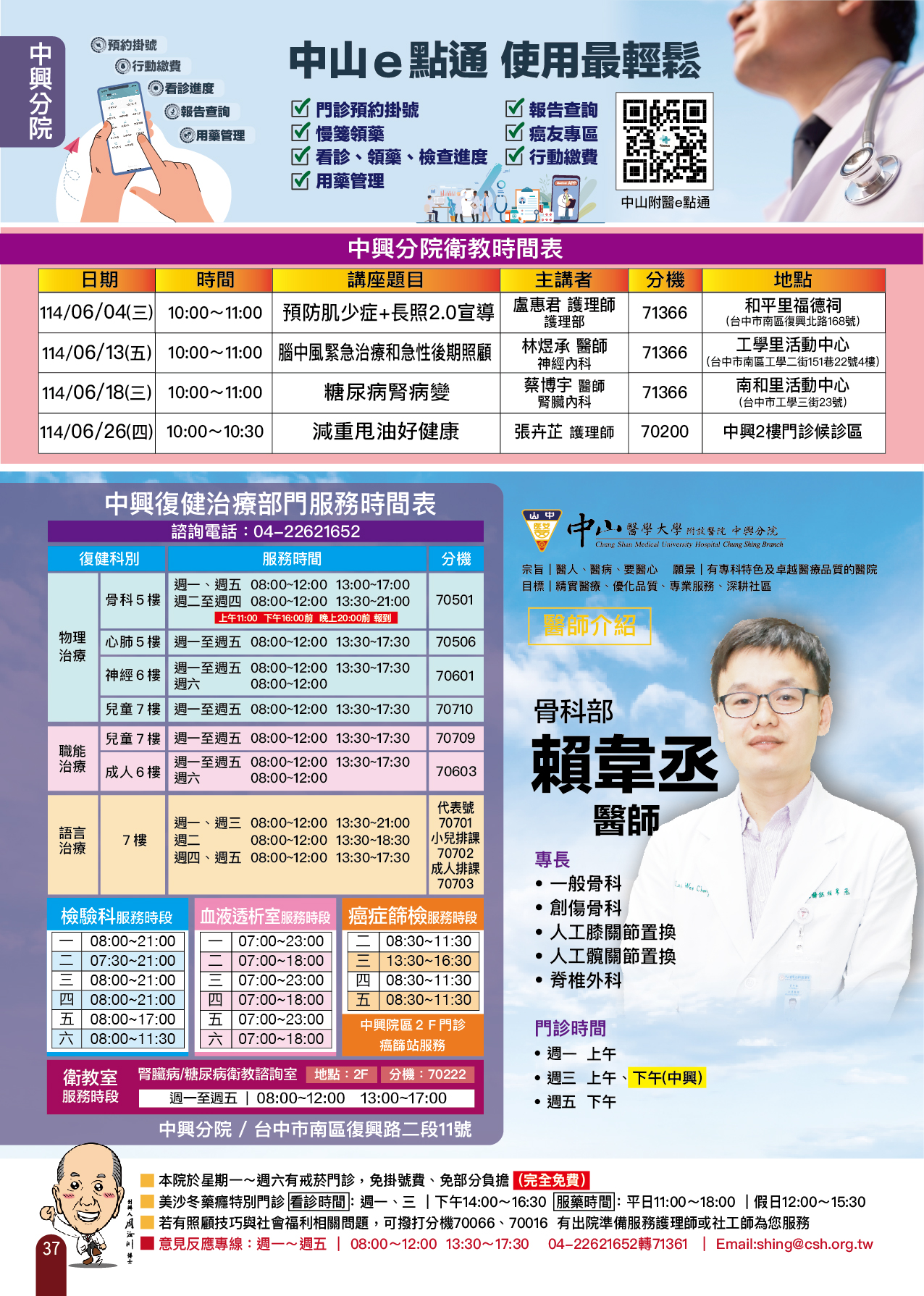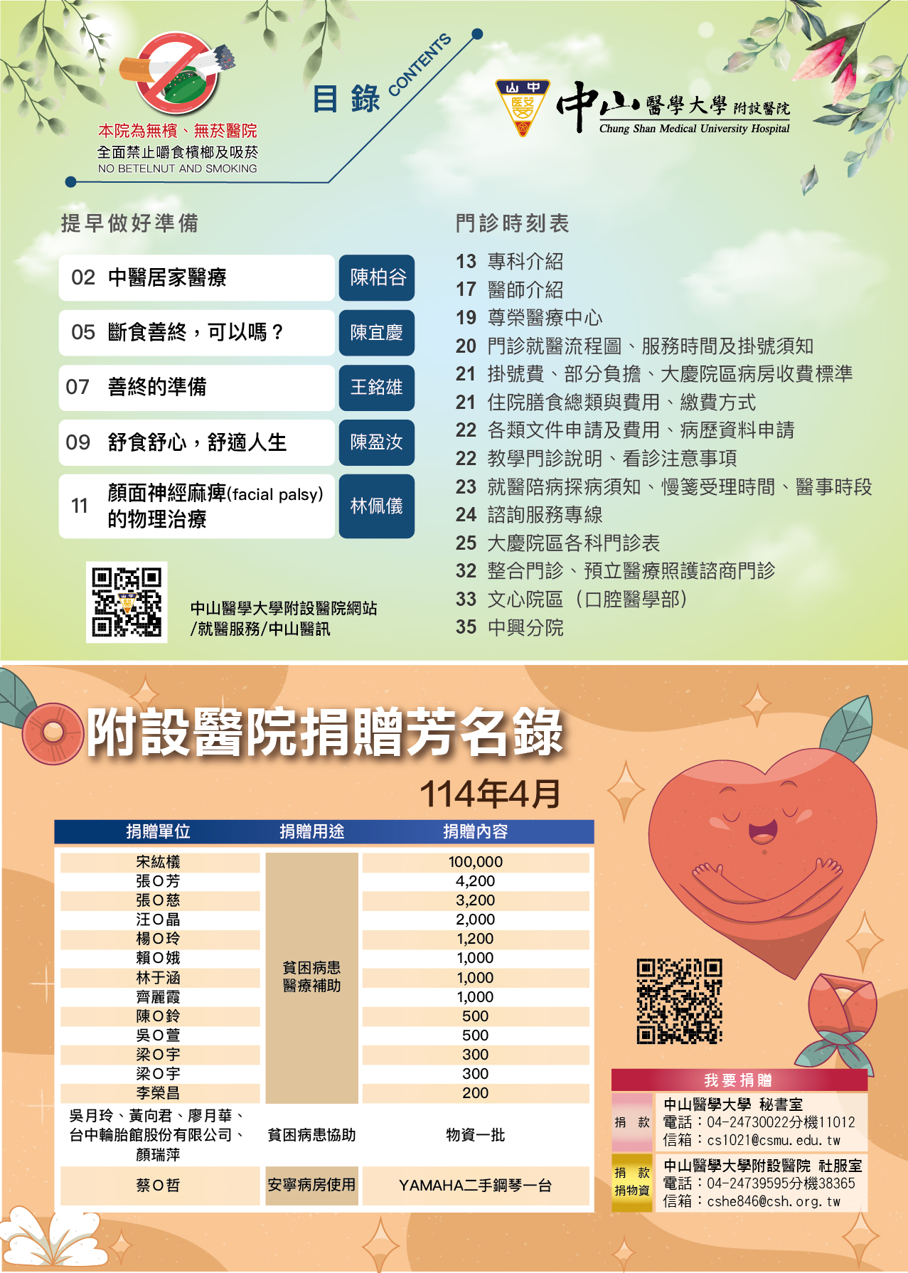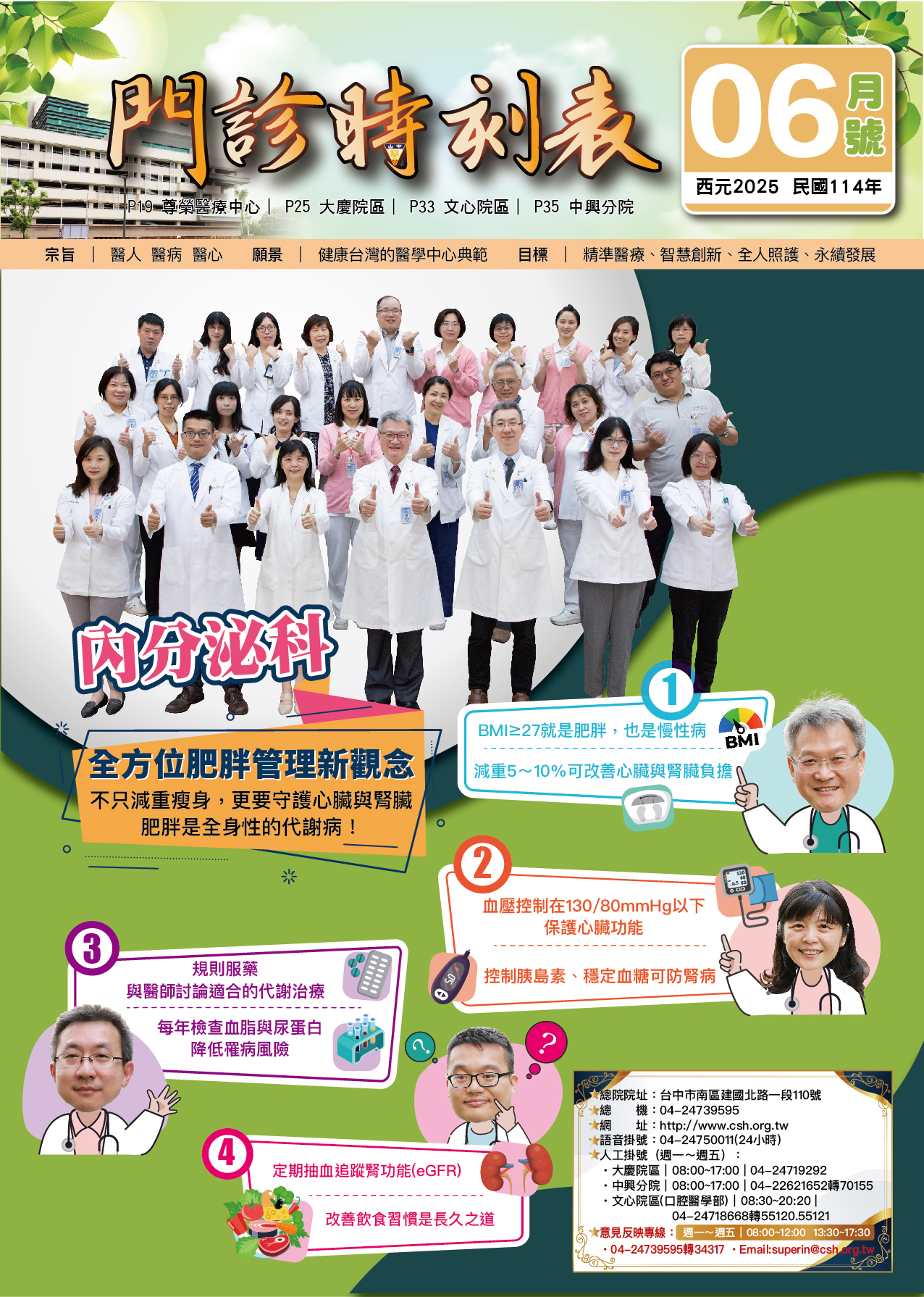 2025年06月 封面主題:中山醫學大學附設醫院 — 內分泌科 門診時刻表 2025 年 05 月 28 日2025 年 05 月 28 日 Chung Shan Medical University Hospital ★ 門診時刻表 切換成幻燈片模式或 建議 點選下列圖示放大觀看 1 2 ► ★ 中山醫訊及衛教文章 切換成幻燈片模式或 建議 點選下列圖示放大觀看