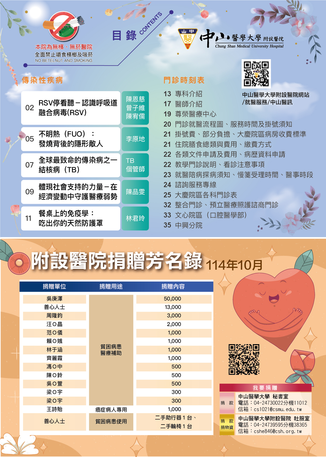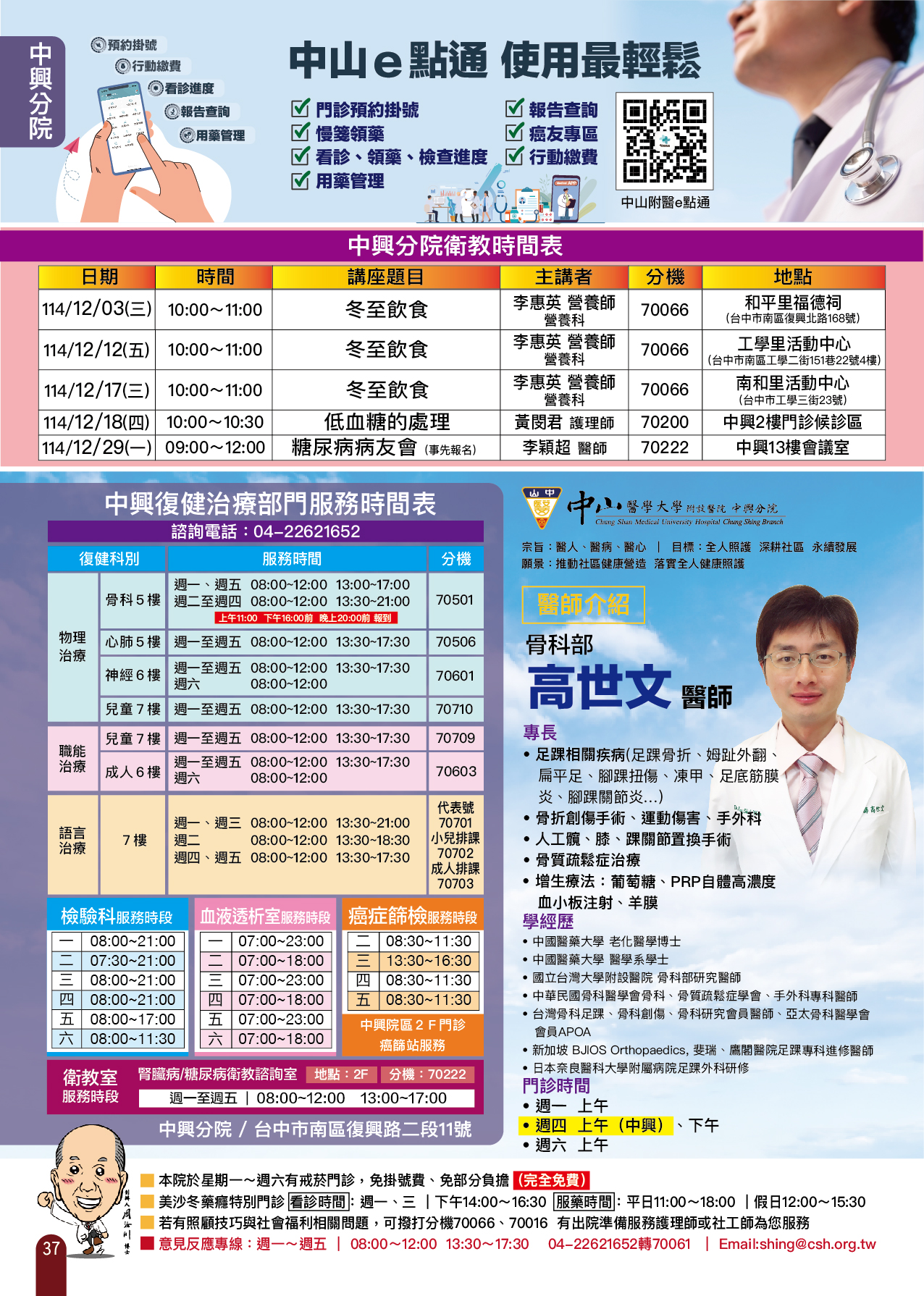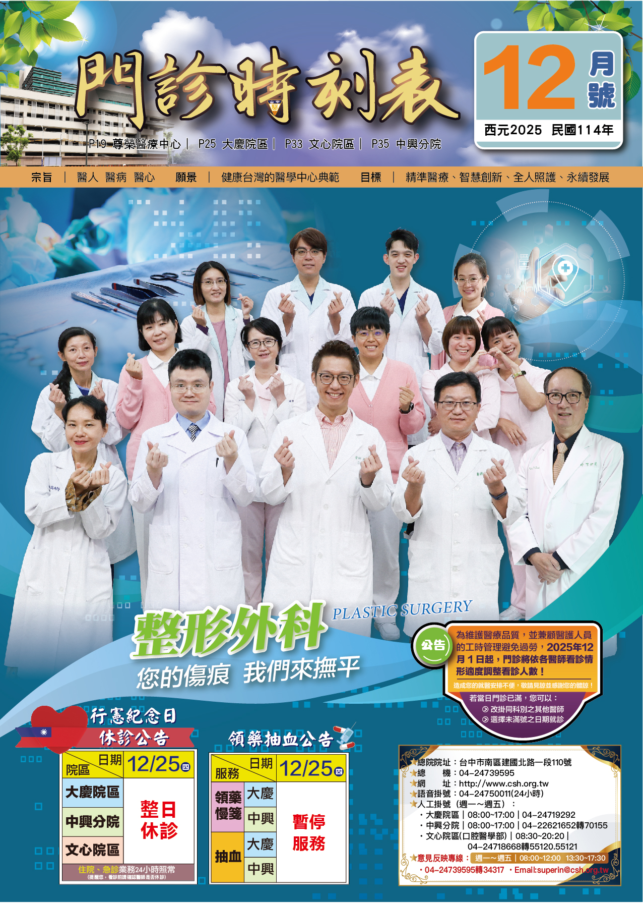 2025年12月 封面主題:中山醫學大學附設醫院 — 整形外科 門診時刻表 2025 年 11 月 28 日2025 年 11 月 28 日 Chung Shan Medical University Hospital ★ 門診時刻表 切換成幻燈片模式或 建議 點選下列圖示放大觀看 1 2 ► ★ 中山醫訊及衛教文章 切換成幻燈片模式或 建議 點選下列圖示放大觀看
