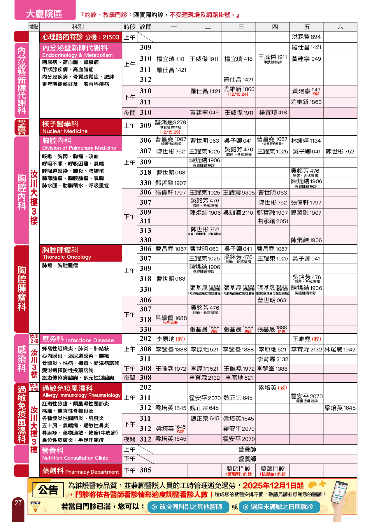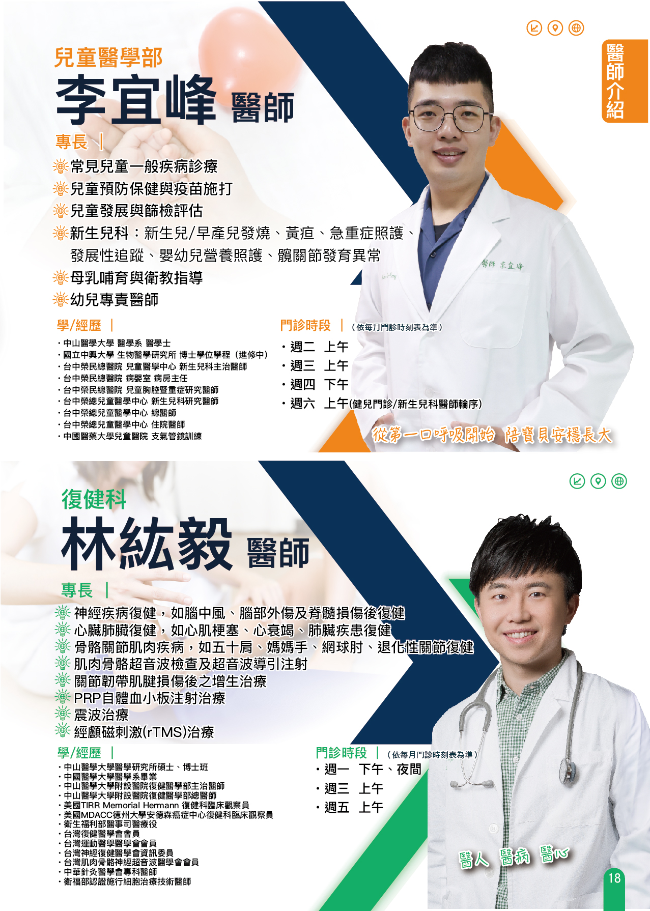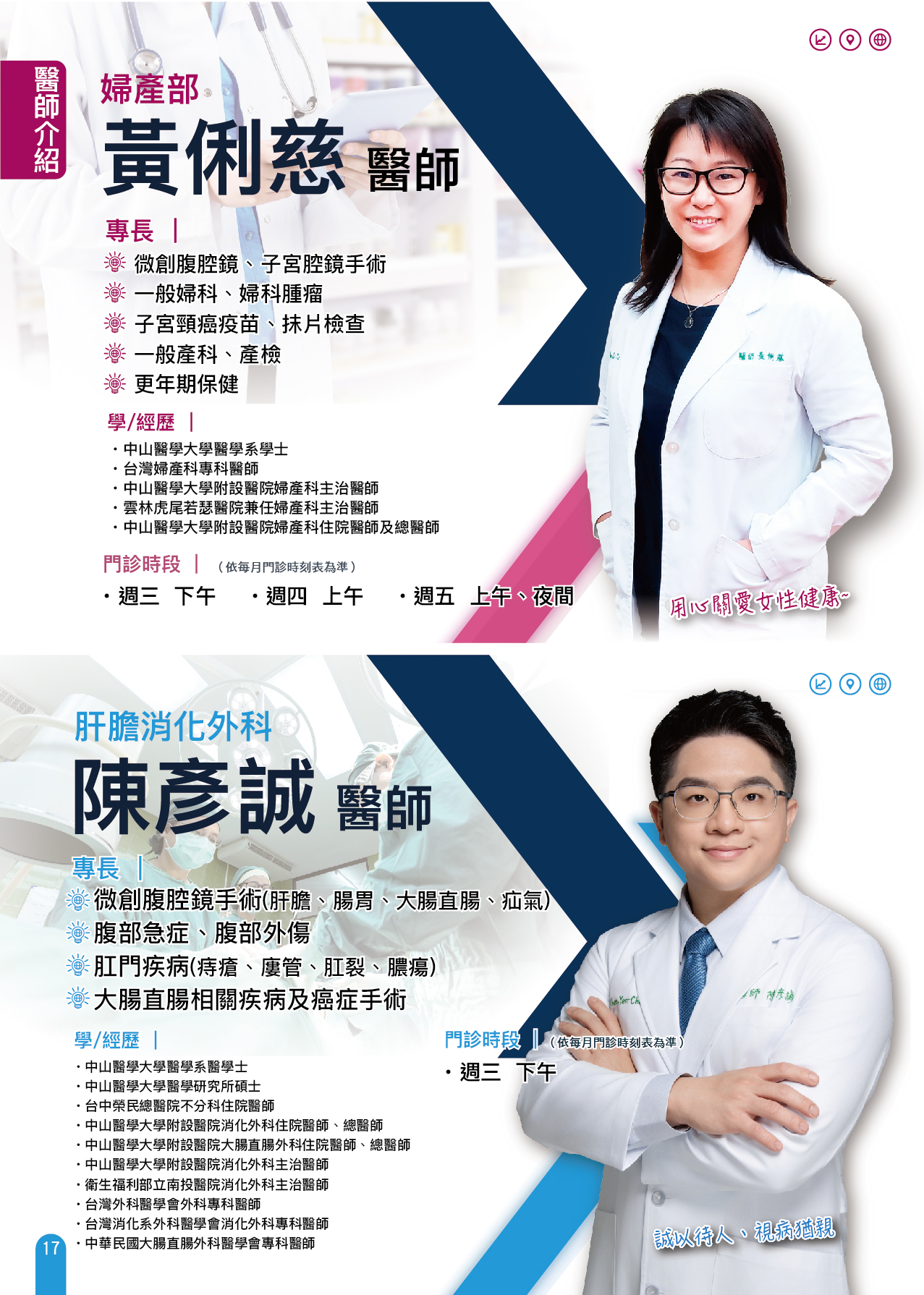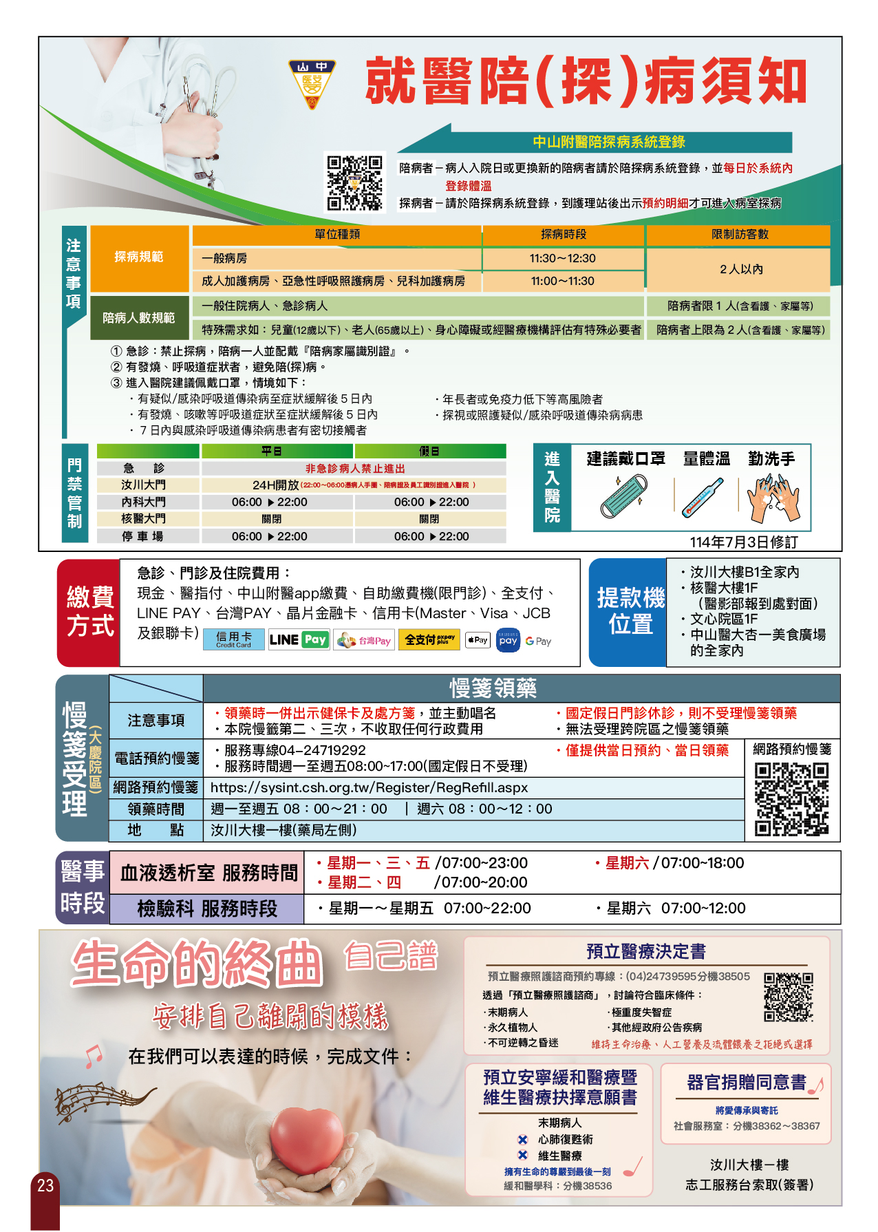 2025年12月 封面主題:中山醫學大學附設醫院 — 整形外科 門診時刻表 2025 年 11 月 28 日2025 年 11 月 28 日 Chung Shan Medical University Hospital ★ 門診時刻表 切換成幻燈片模式或 建議 點選下列圖示放大觀看 1 2 ► ★ 中山醫訊及衛教文章 切換成幻燈片模式或 建議 點選下列圖示放大觀看