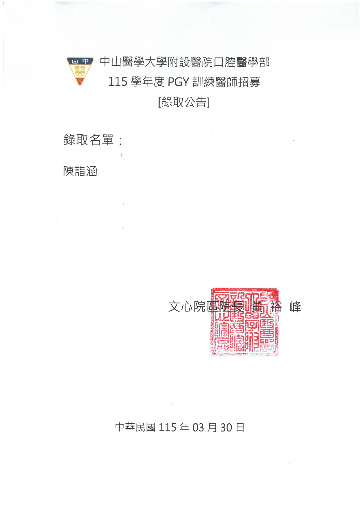 【公告】115年度牙醫PGY訓練醫師二招[錄取公告] 最新公告 2026 年 03 月 30 日2026 年 03 月 31 日 Chung Shan Medical University Hospital