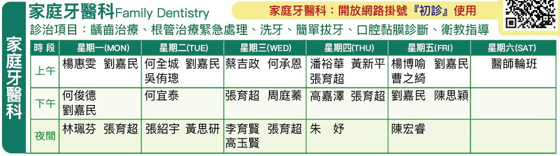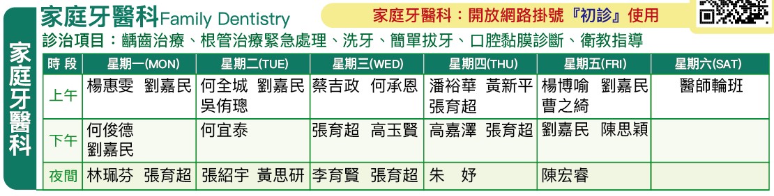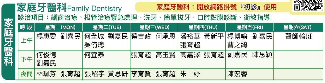 診治項目:齲齒治療、根管治療緊急處理、洗牙、簡單拔牙、口腔黏膜診斷、衛教指導