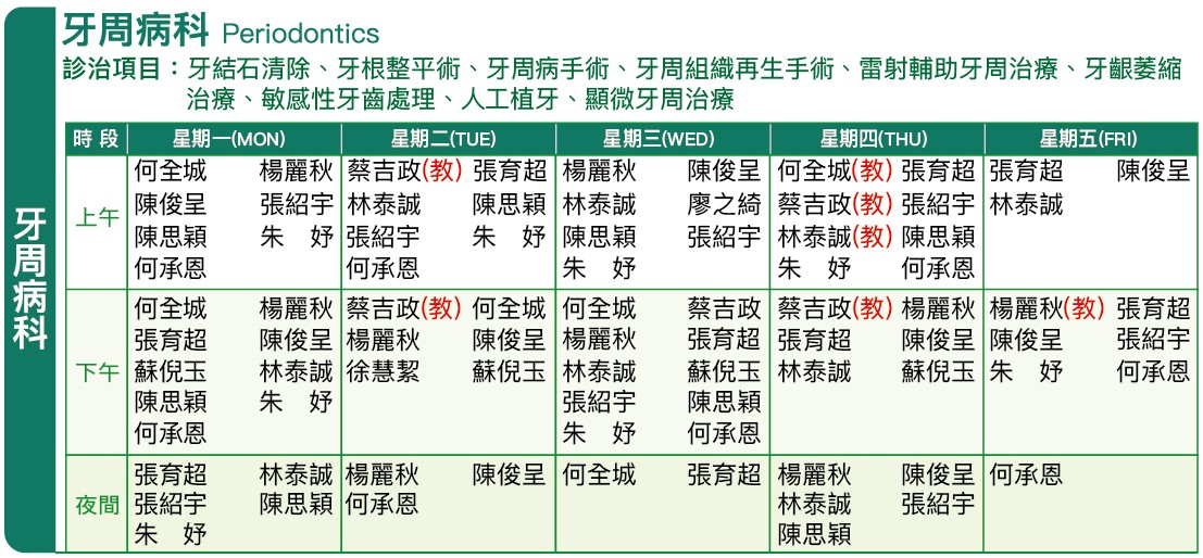 診治項目:牙周病手術、 人工植牙、牙結石清除、牙根整平術、牙齦下搔刮術、牙菌斑控制、敏感性牙齒雷射治療