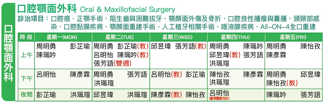 口腔顎面外科 診治項目:口腔癌、正顎手術、阻生齒與困難拔牙、顎顏面外傷及骨折、口腔良性腫瘤與囊腫、頭頸部感染、口腔黏膜疾病、顎顏面重建手術、人工植牙相關手術、唾液腺疾病 醫師姓名 醫師分機 彭芷瑜 醫師 55152 呂明怡 醫師 55144 邱昱瑋 醫師 55145 陳怡孜 醫師 55153 陳珮吟 醫師 55150 陳彥霖 醫師 55147 張芳語 醫師 55146 口腔顎面外科諮詢專線 55143