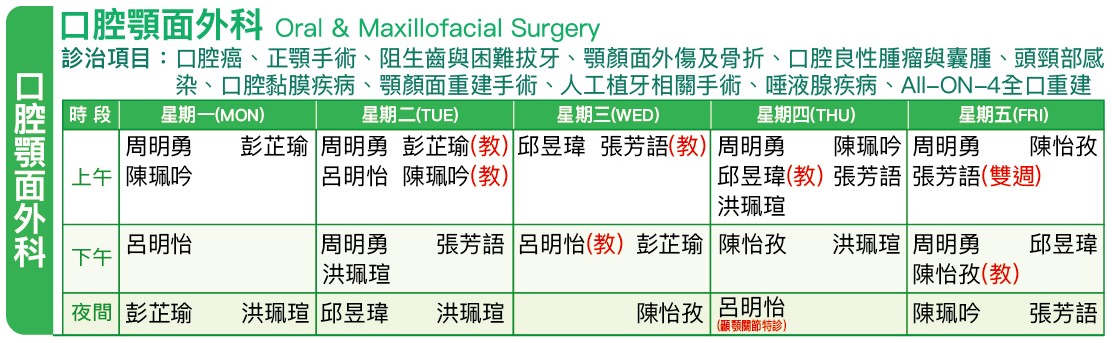 口腔顎面外科 診治項目:口腔癌、正顎手術、阻生齒與困難拔牙、顎顏面外傷及骨折、口腔良性腫瘤與囊腫、頭頸部感染、口腔黏膜疾病、顎顏面重建手術、人工植牙相關手術、唾液腺疾病 醫師姓名 醫師分機 彭芷瑜 醫師 55152 呂明怡 醫師 55144 邱昱瑋 醫師 55145 陳怡孜 醫師 55153 陳珮吟 醫師 55150 張芳語 醫師 55146 口腔顎面外科諮詢專線 55143