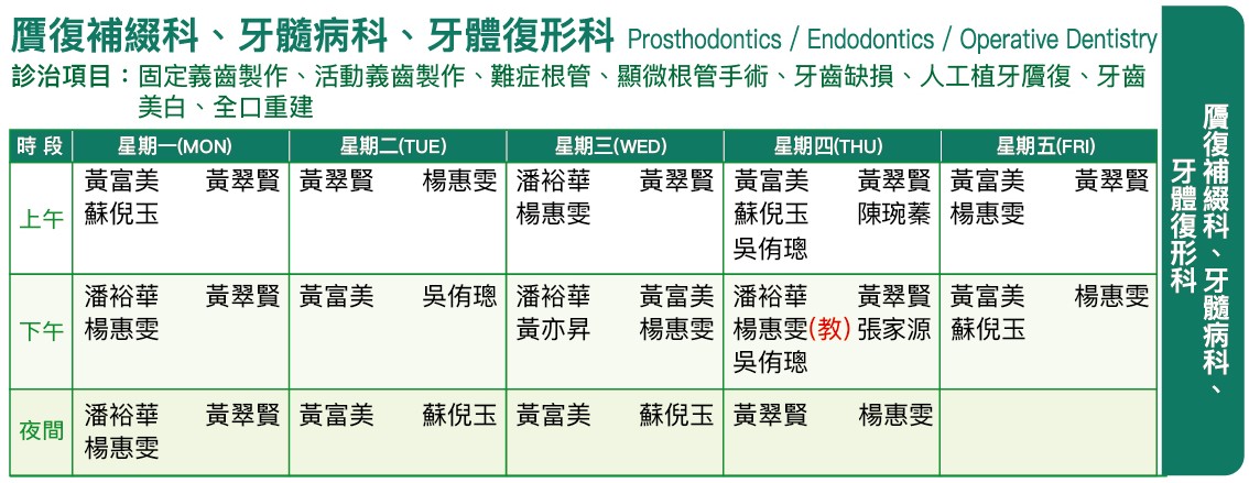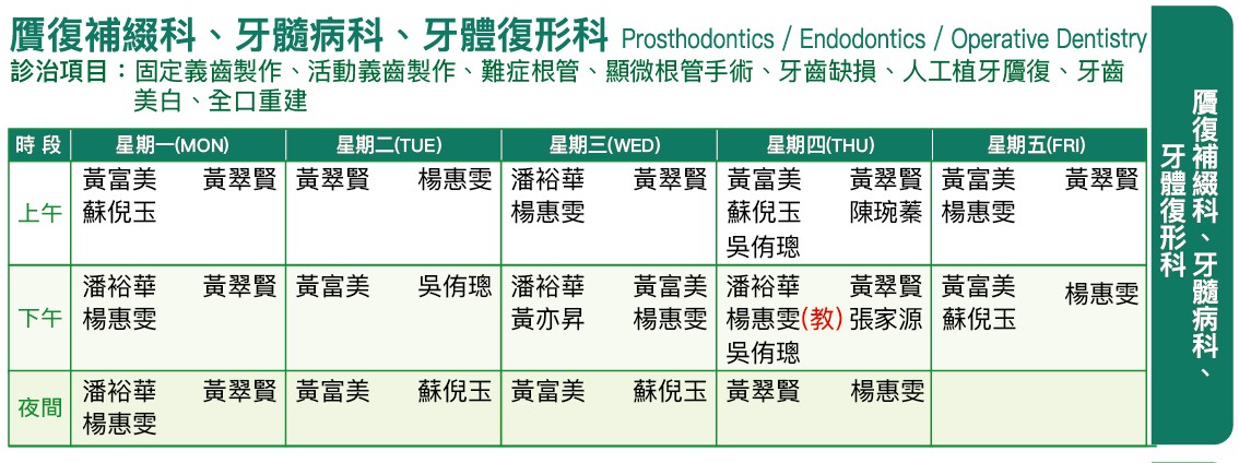贋復補綴科、牙髓病科、牙體復形科 診治項目:固定義齒製作、活動義齒製作、難症根管、顯微根管手術、牙齒缺損、人工植牙、牙齒美白、全口重建 醫師姓名 醫師分機 潘裕華 醫師 55231 楊惠雯 醫師 55236 黃富美 醫師 55268 黃翠賢 醫師 55266 陳琬蓁 醫師 55239 蘇倪玉 醫師 55264 吳侑聰 醫師 55269 張家源 醫師 55239