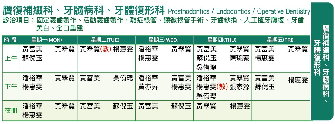 診治項目:固定義齒製作、活動義齒製作、難症根管、顯微根管手術、牙齒缺損、人工植牙、牙齒美白、全口重建