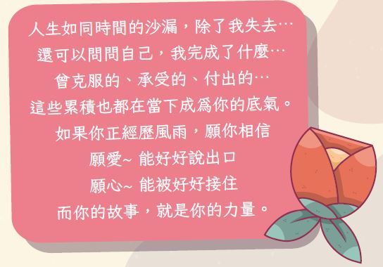 我說:「承受這麼大的病痛,有情緒是正常的,有時硬撐會讓想關心的人不知道怎麼靠近。謝謝妳願意說出自己的故事,這些都是妳和家人的力量。說出來很好,也希望妳今晚能睡好一點。」