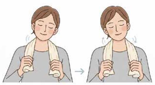 2. 頸部放鬆(來回20次):準備一條乾爽的長毛巾,繞過頸後,雙手輕輕拉住兩側。隨後雙手輪流緩慢下滑,藉由毛巾的牽引力帶動脖子輕柔轉動。