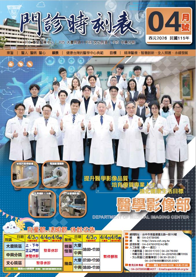 115年 04月刊 目錄 各期目錄 2026-04-082026-04-08 CSHLeave a Comment on 115年 04月刊 目錄 守護巴掌仙子的未來:早產兒神經發展與早期療育 兒童發展篩檢服務:守護孩子成長的重要關鍵 嬰幼兒呼吸道殺手—淺談呼吸道融合病毒 過敏控制好,轉骨沒煩惱 注意力不足過動症(ADHD) 守護兒童成長藍圖:從日常飲食到微量營養的全方位指南
